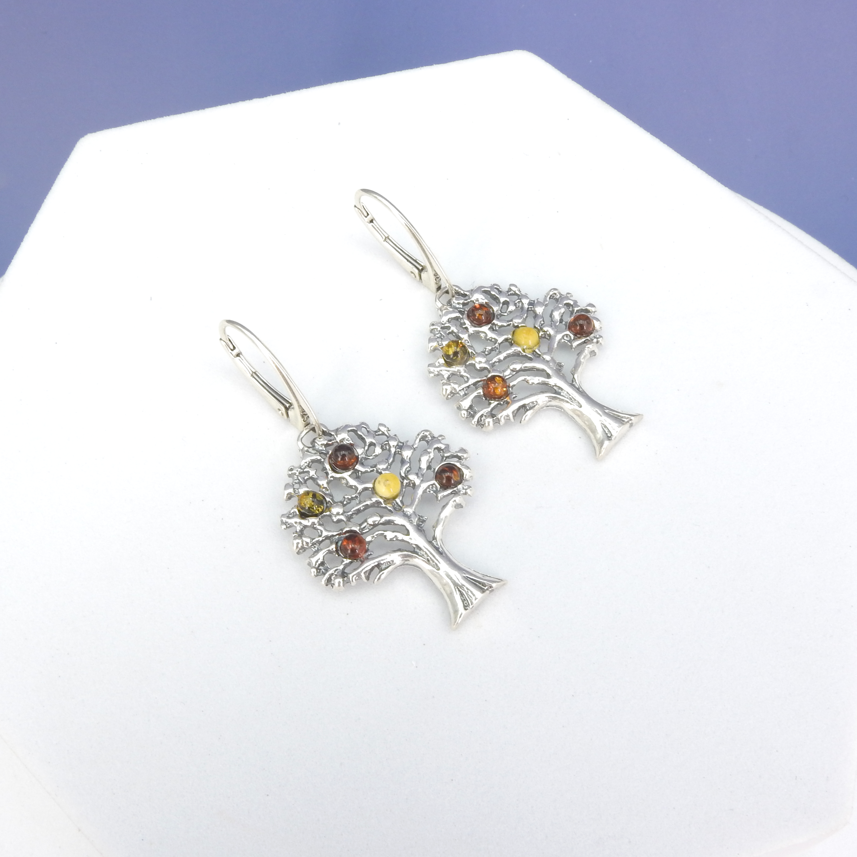 Beautiful silver Tree of Life and amber earrings Amber is fossilized tree resin and can be a variety of colors - Amber is said to absorb negative energies and transforms them to positive energy - Sterling silver with oxidized details - Baltic amber - Measures 1 1/4" long 1" wide - Leverback ear wires