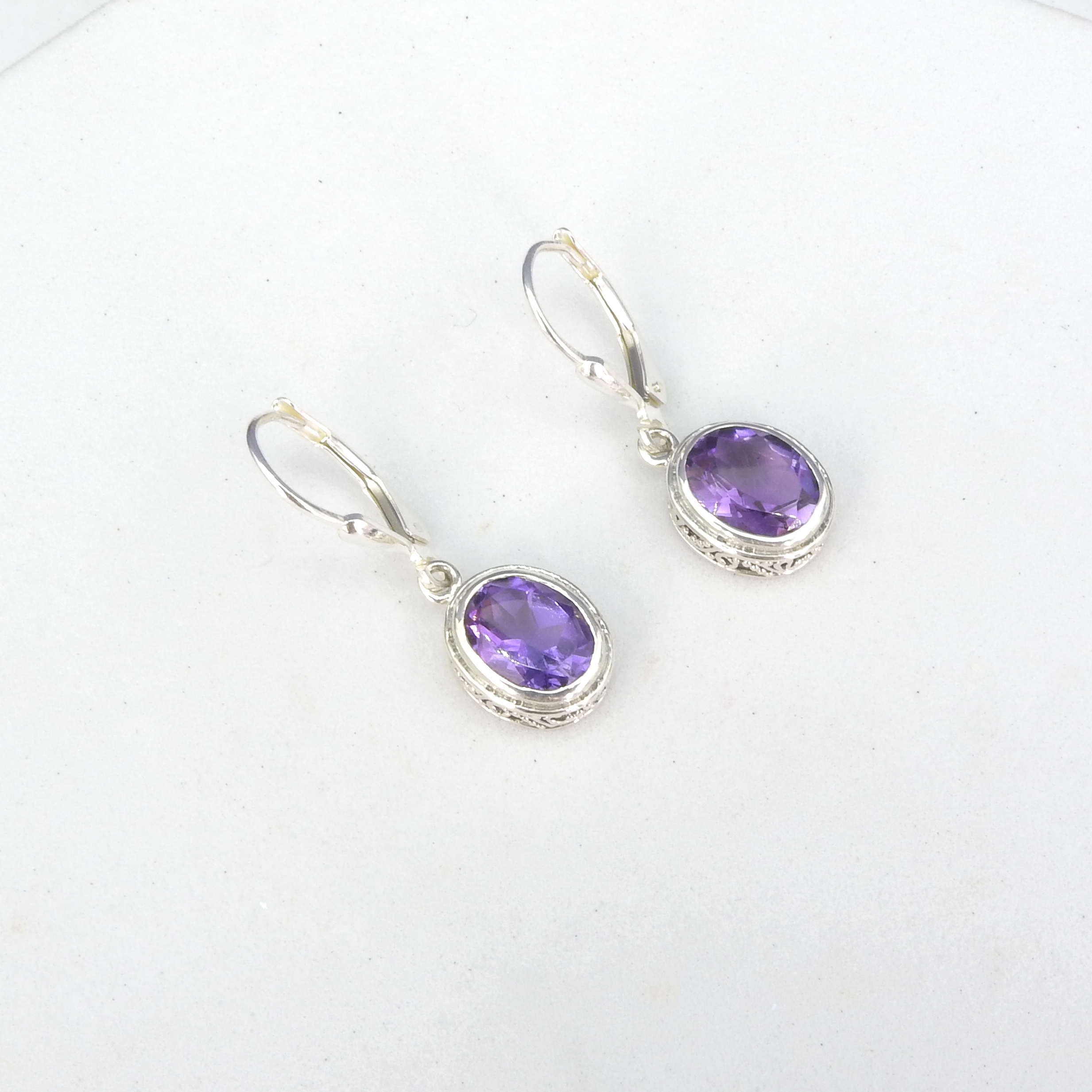 Beautiful faceted amethyst small dangle earrings with decorative setting - Sterling silver - Faceted amethyst - Measures 1/2" long 3/8" wide - Leverback ear wires