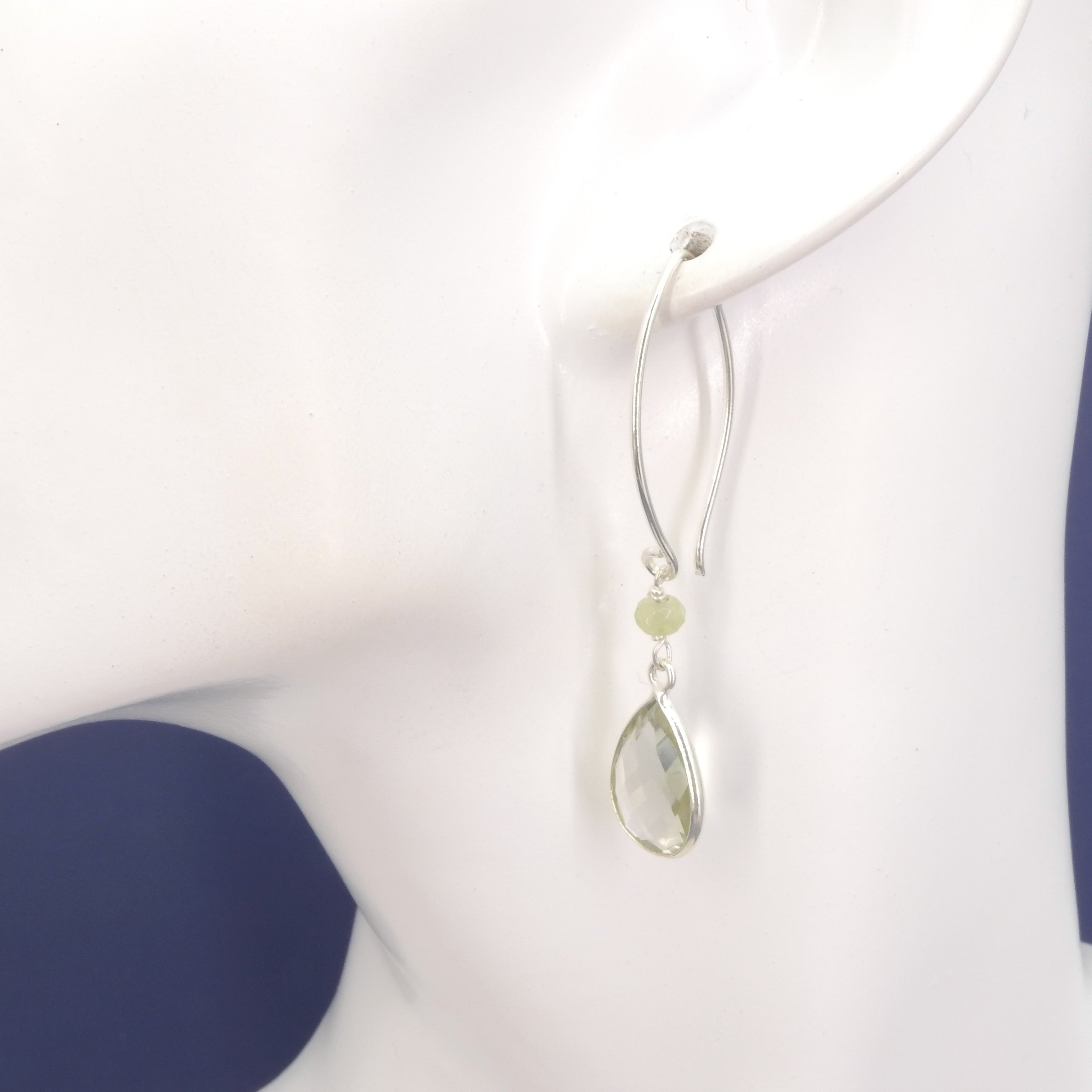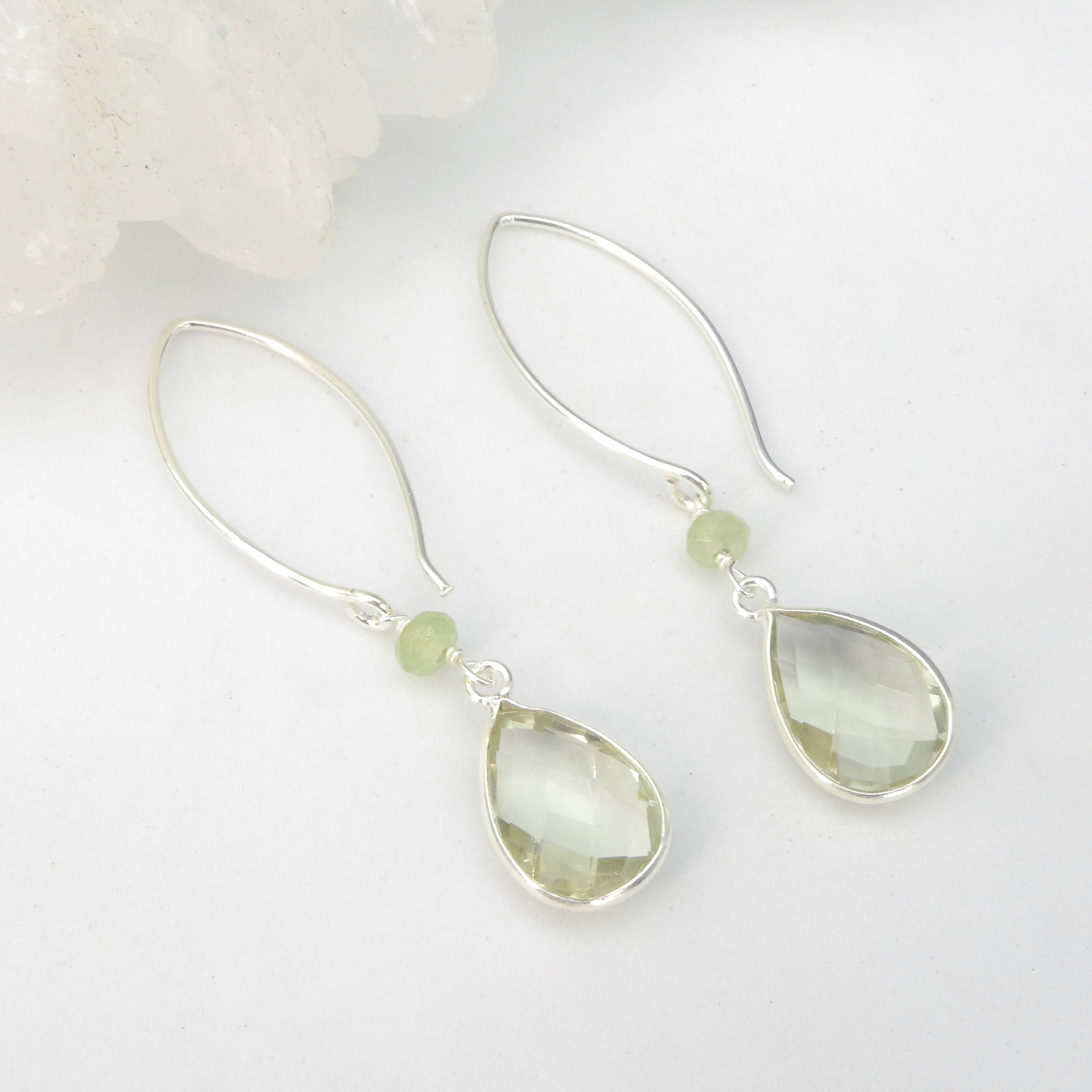 Beautiful green amethyst dangle earrings - Sterling silver - Faceted green amethyst - Measures 2" long from top of ear wire 3/8" wide - Fishhook ear wires