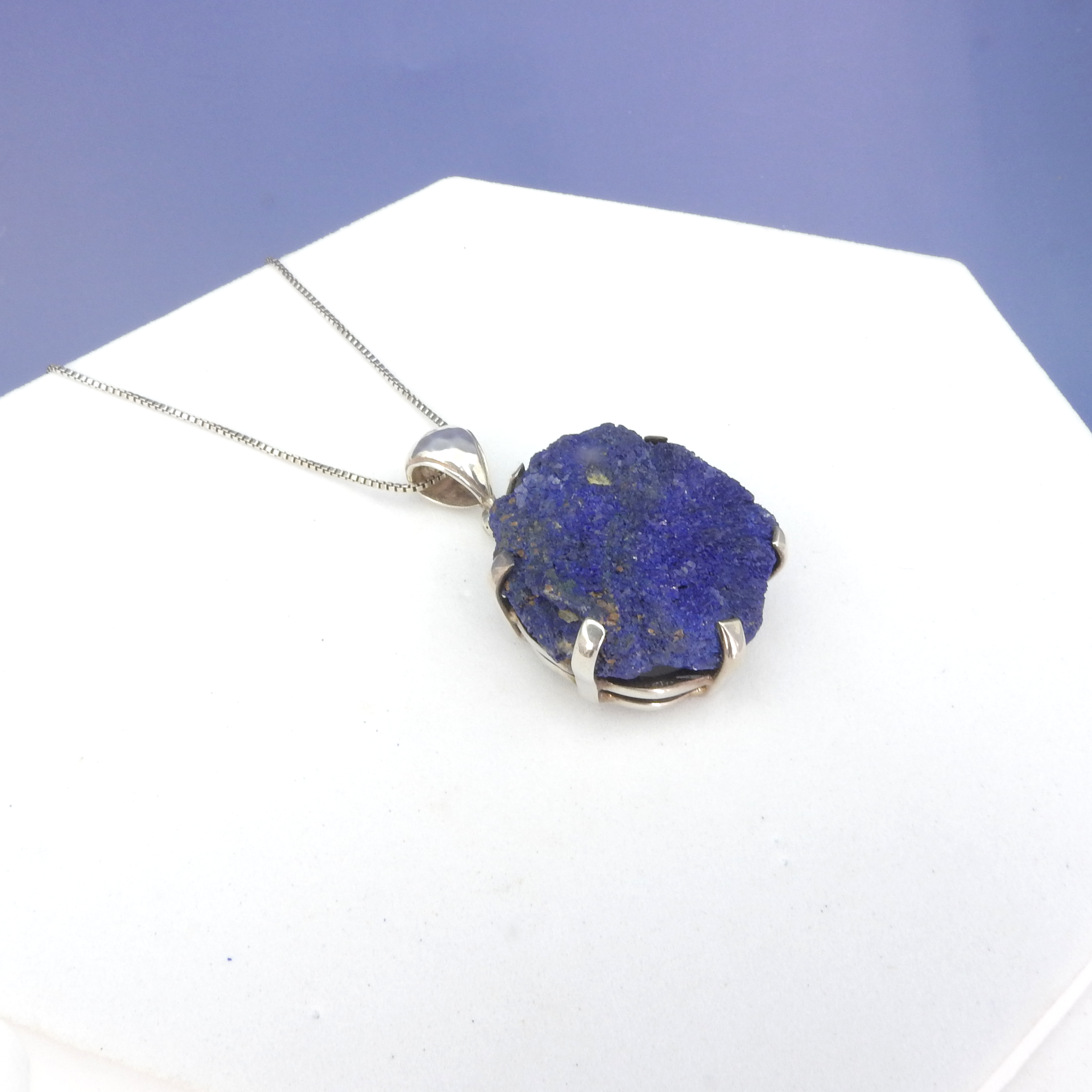 Striking blue azurite druzy pendant in sterling silver - Free form azurite druzy - Set in sterling silver with open back - 1 1/2" long with bale 1" wide - 18" silver chain included - Azurite is a soft stone and can be damaged if chemicals are used around it. Take off before using fragrances or hairspray.