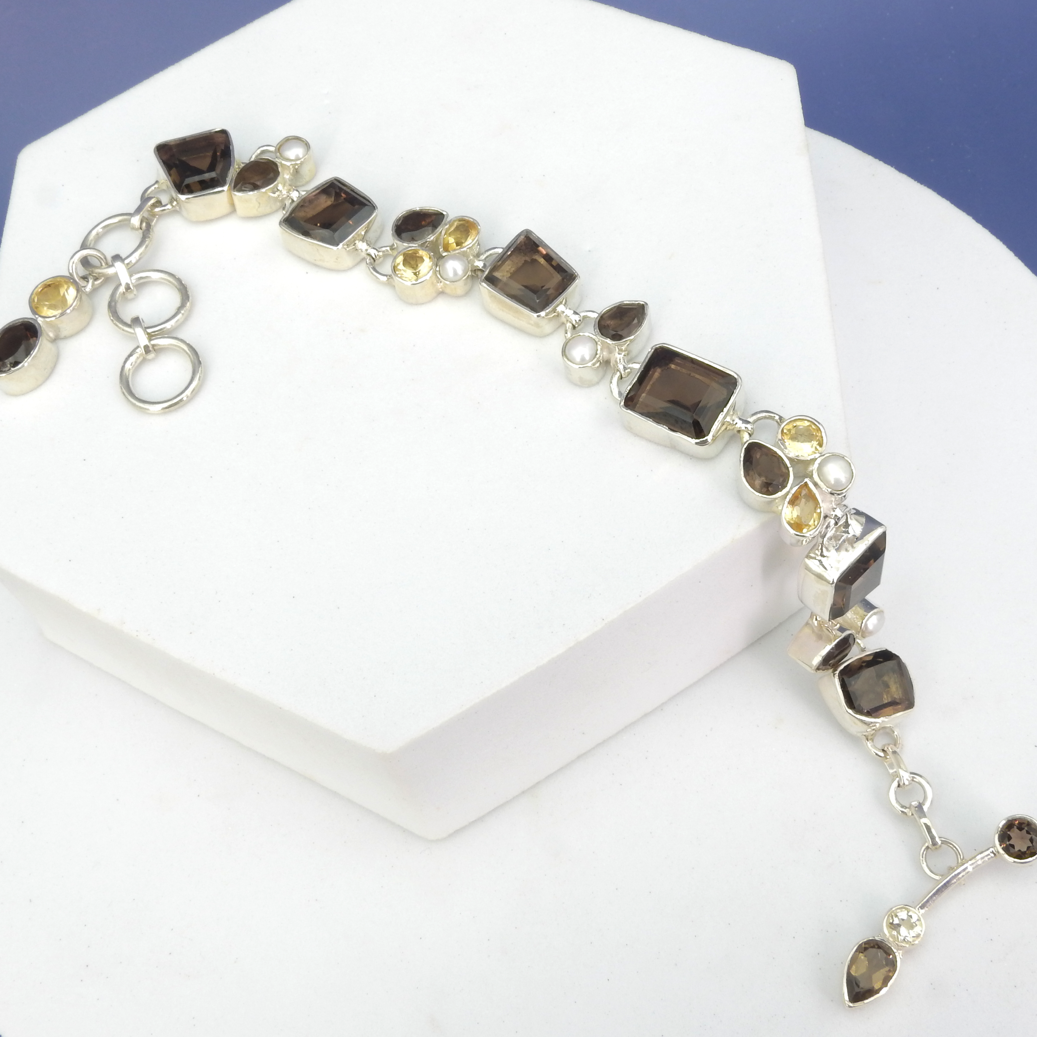 Sterling Silver Smokey Quartz, Pearl & Citrine Statement Bracelet
