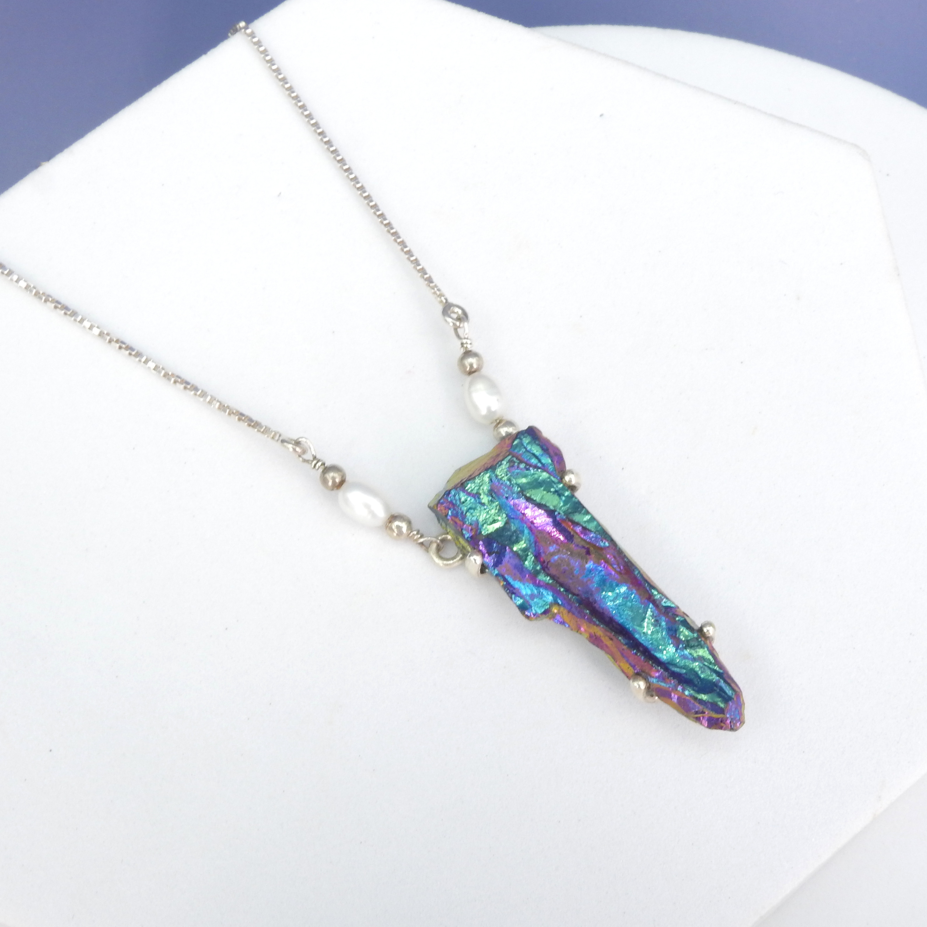 Sterling silver colorful aqua aura & pearl necklace - Sterling silver - Aqua aura & pearl - 2" long 3/4" wide - Adjustable chain 14" - 18" long