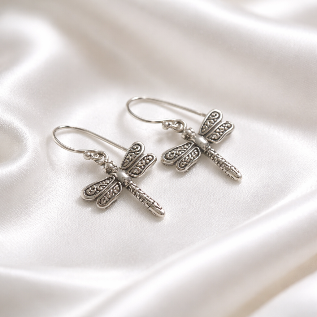 Beautiful sterling silver dragonfly earrings - Sterling silver with oxidized details - Measures 3/4" long 3/4" wide - Fishhook ear wires