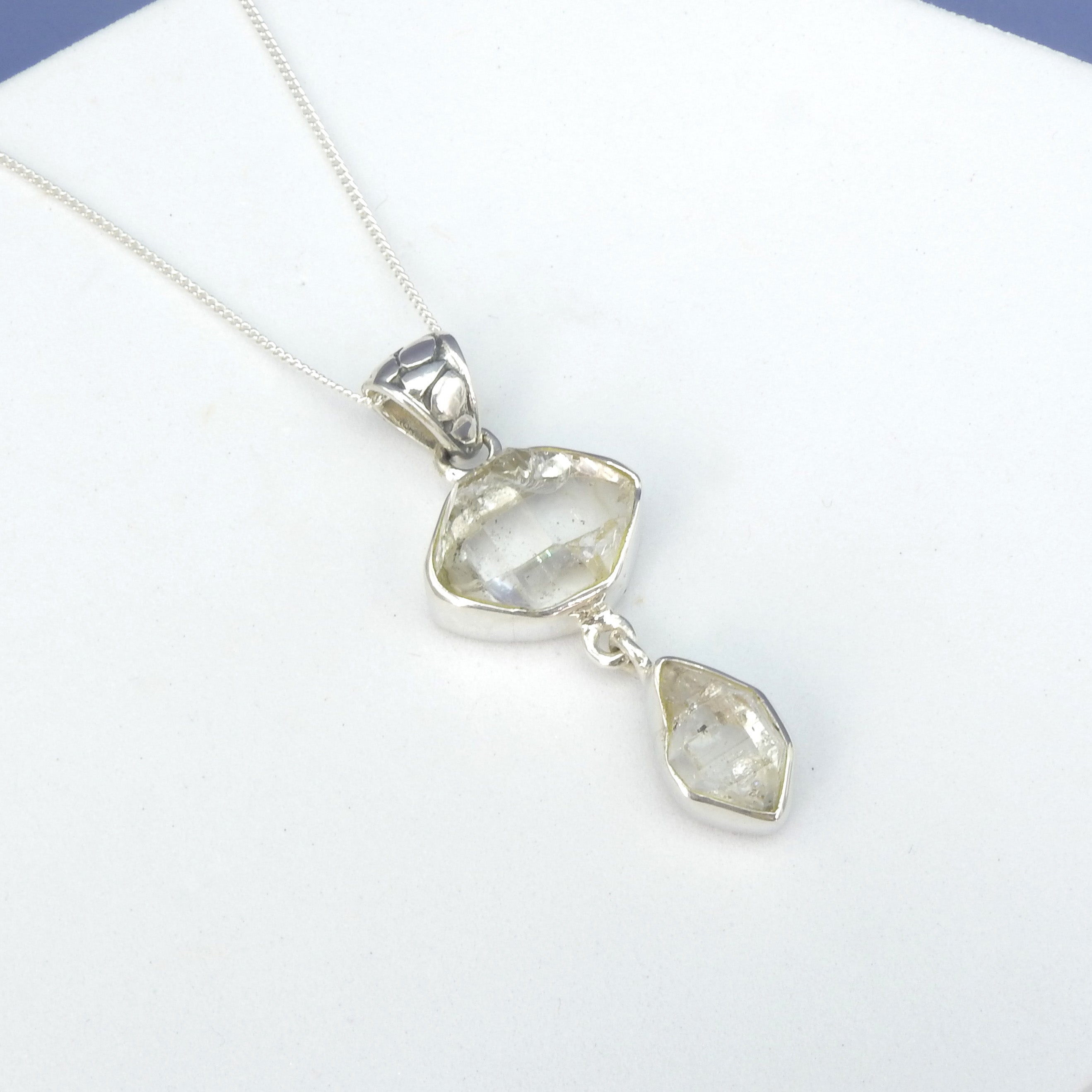 Lovely double Herkimer diamond pendant - Sterling silver - Two Herkimer diamonds - Decorative bale - Measures 1 3/4" long with bale 3/4" wide - 18" silver chain