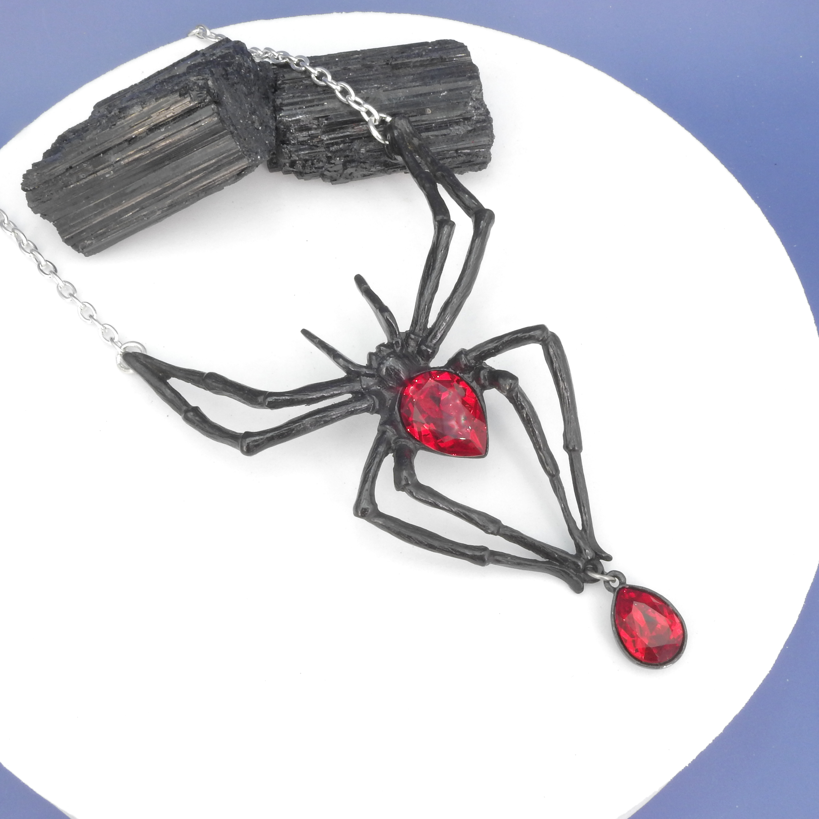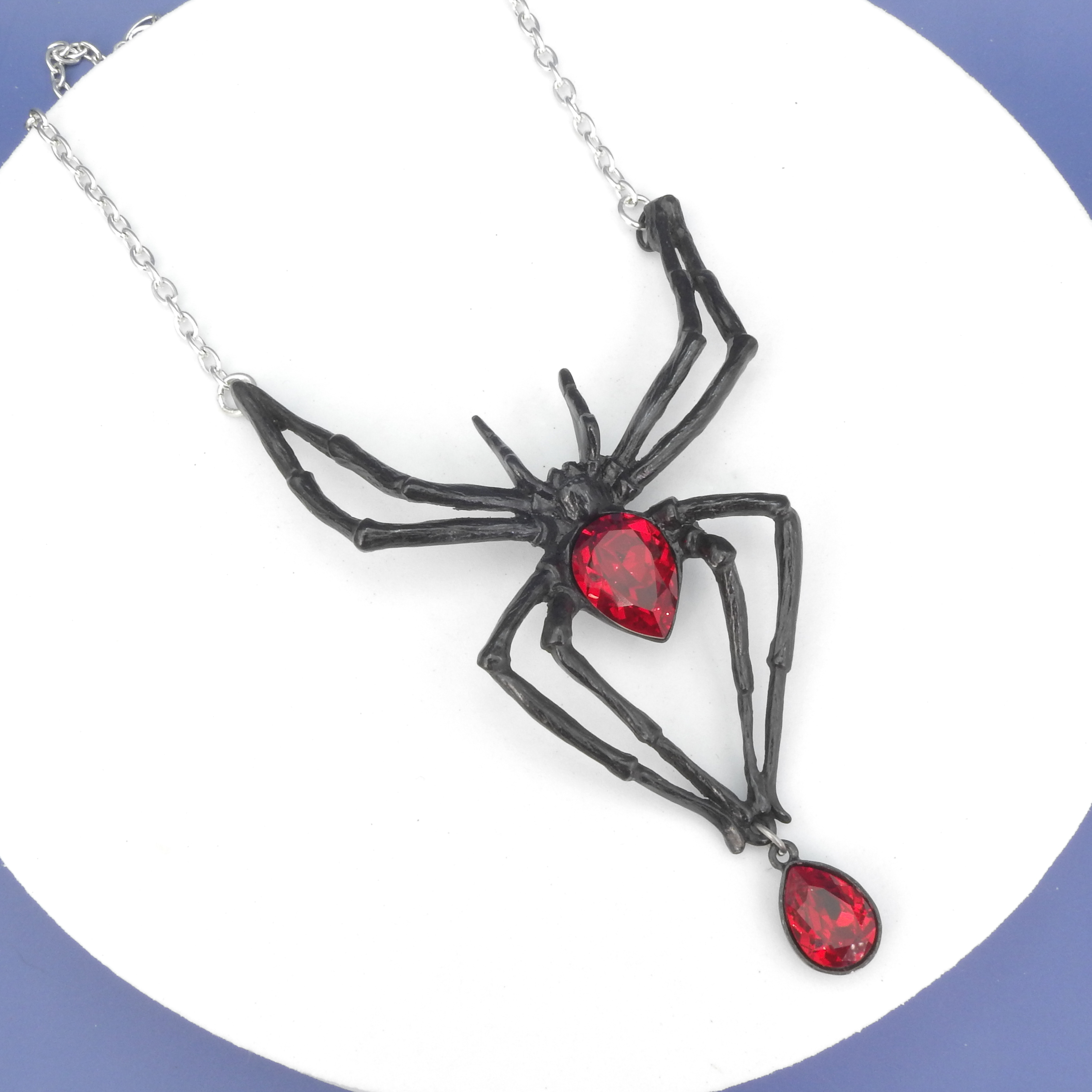 Make a BIG statement with this pewter and Austrian crystal large Black Widow spider necklace The perfect standout piece to add drama to your outfit - English pewter with oxidized details - Measures 4 1/2" long 3" wide - Adjustable chain measures up to 16" long Made in England