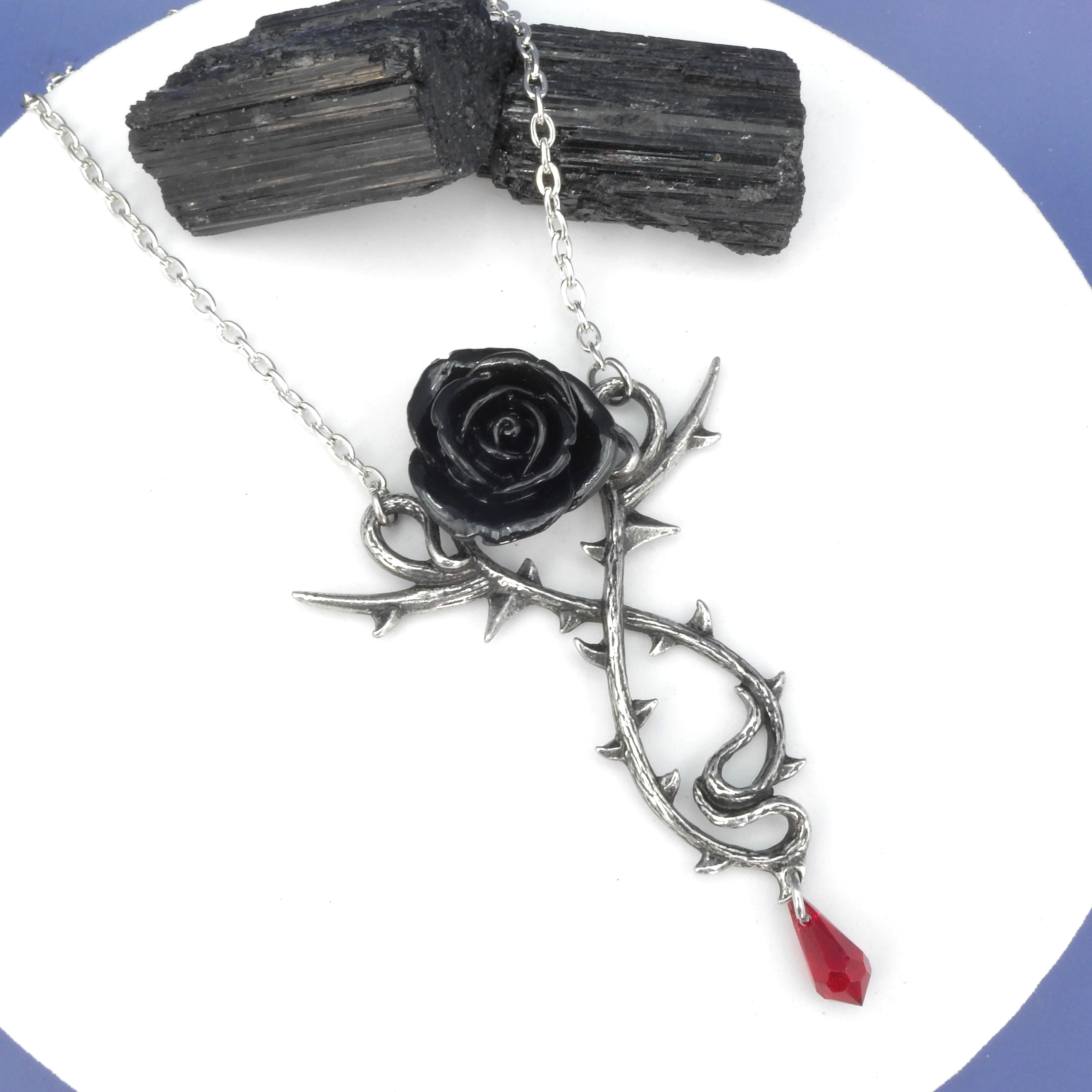 Make a strong statement with this pewter and crystal large black rose with thorns necklace The perfect standout piece to add drama to your outfit - English pewter with oxidized details - Black rose and red crystal dangle - Measures 4" long 2 3/4" wide - Adjustable chain measures from 17" - 21" long Made in England