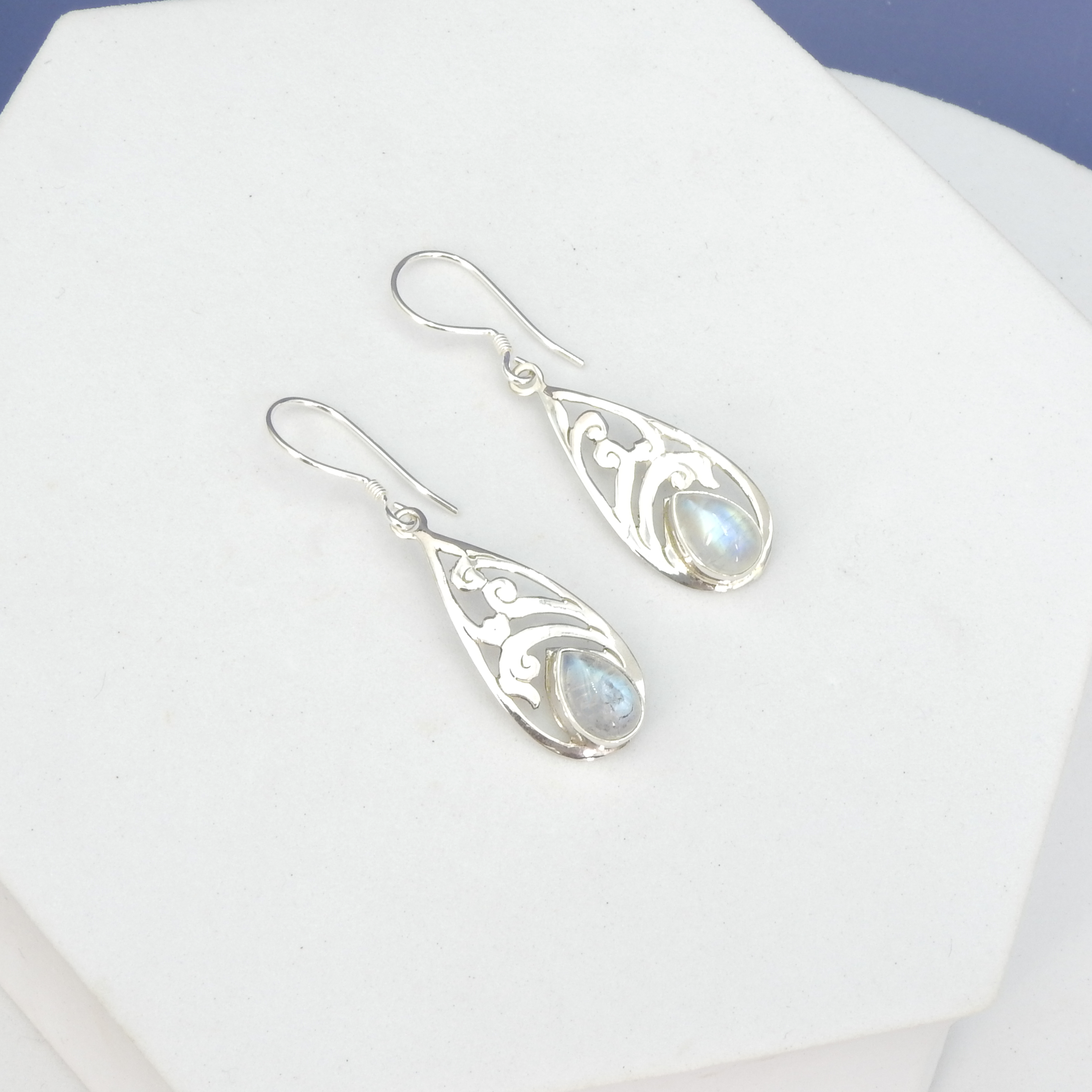 Elegant sterling silver scroll pattern earrings with moonstone - Sterling silver - Rainbow moonstone - 1" in long 1/2" wide - Fishhook ear wire