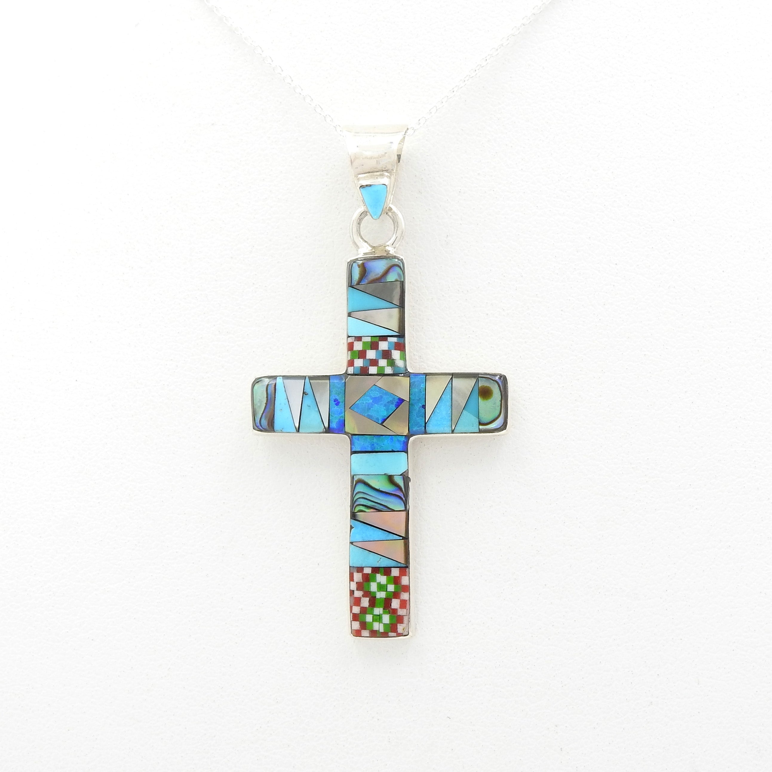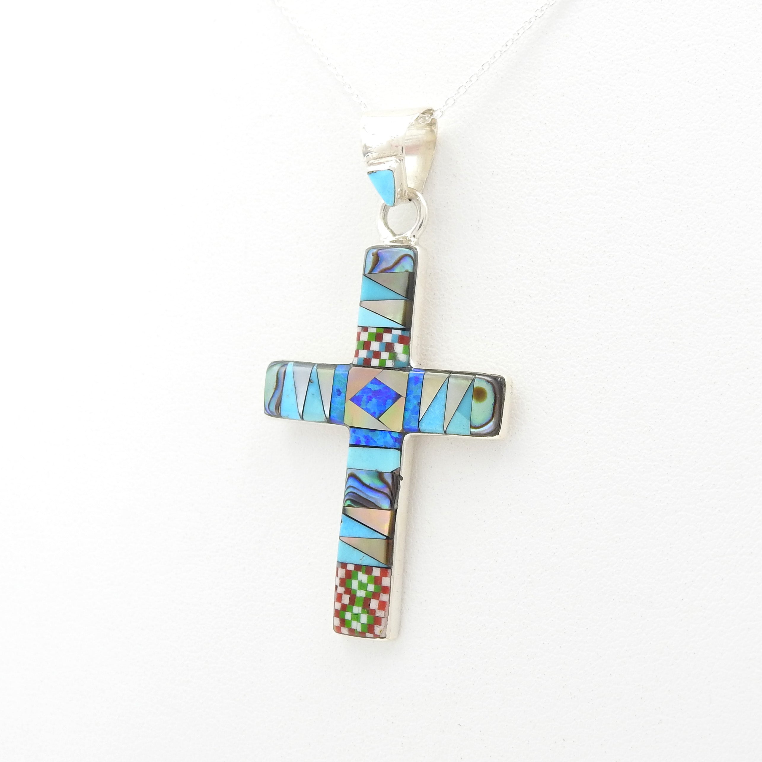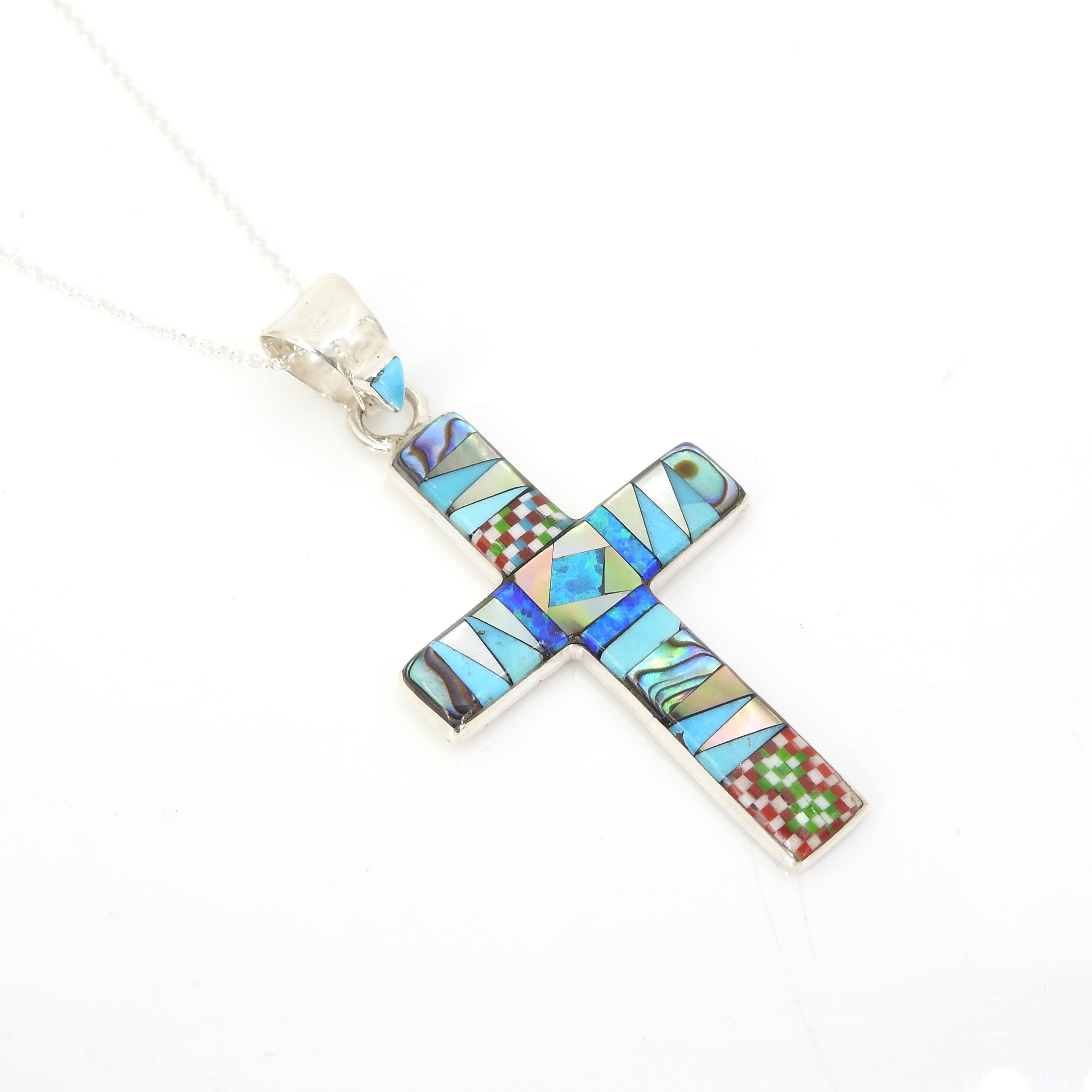 Beautiful handmade inlay cross pendant - Detailed inlay with created opal, turquoise, abalone shell, and mother of pearl inlay - Sterling silver - Measures 2" long with bale 1" wide - 18" silver chain included