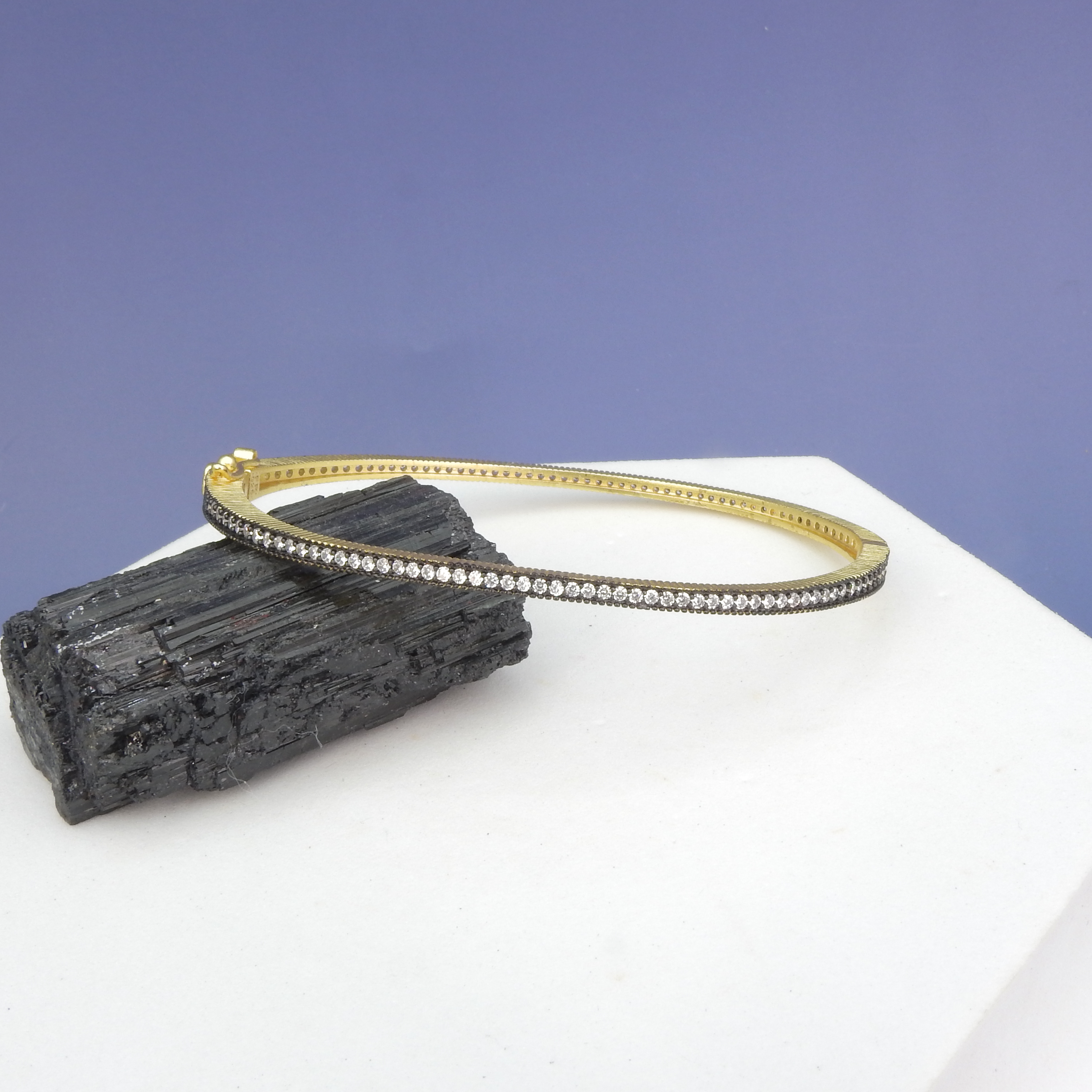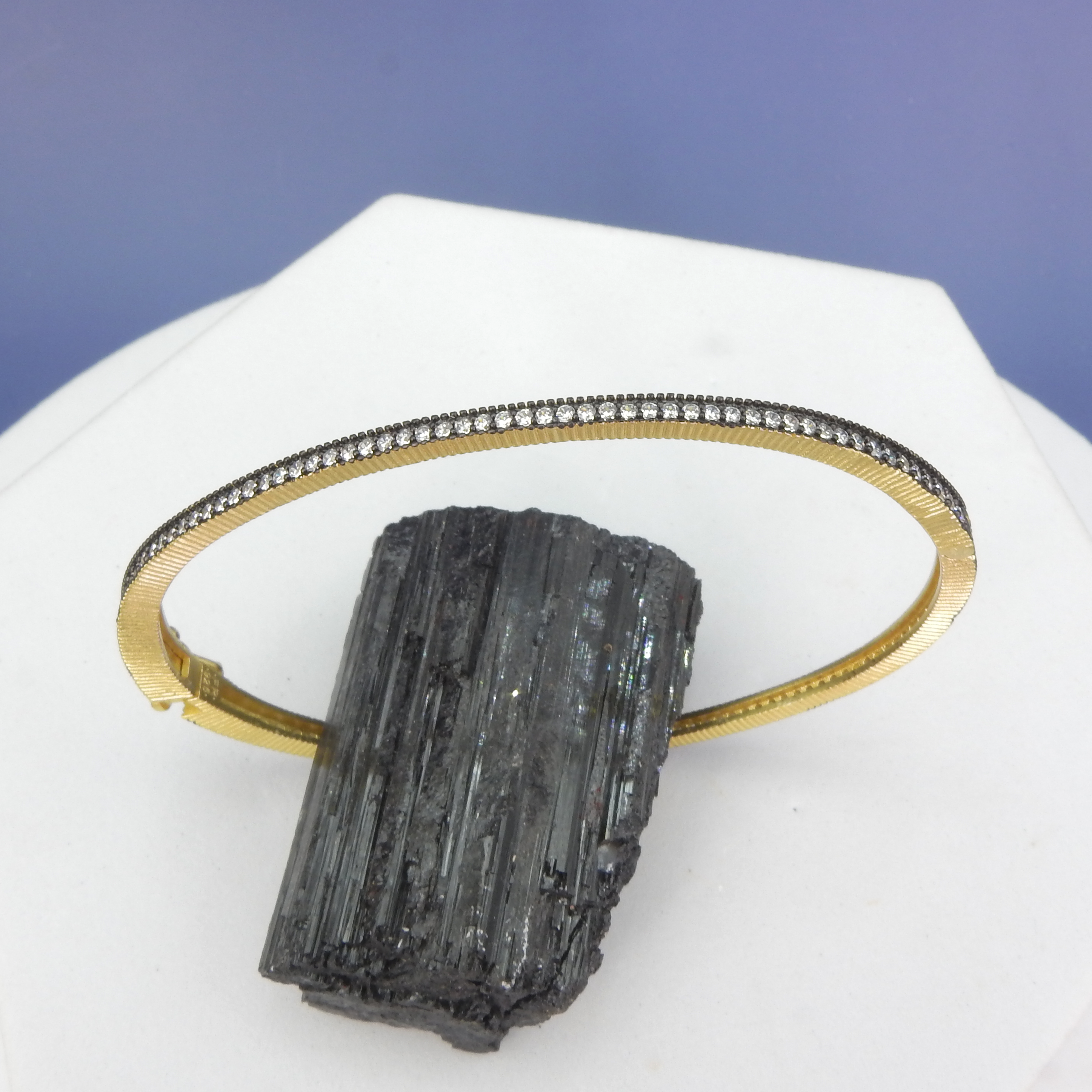 Gorgeous hinged CZ bangle by Brooklyn, NY jewelry designer Freida Rothman Perfect to stack with other bracelets for a modern look - 14KT rhodium over sterline silver core - Matte black rhodium over sterling silver core - Hand set CZ - Roughly 7 1/2" - Secure clasp for easy on and off