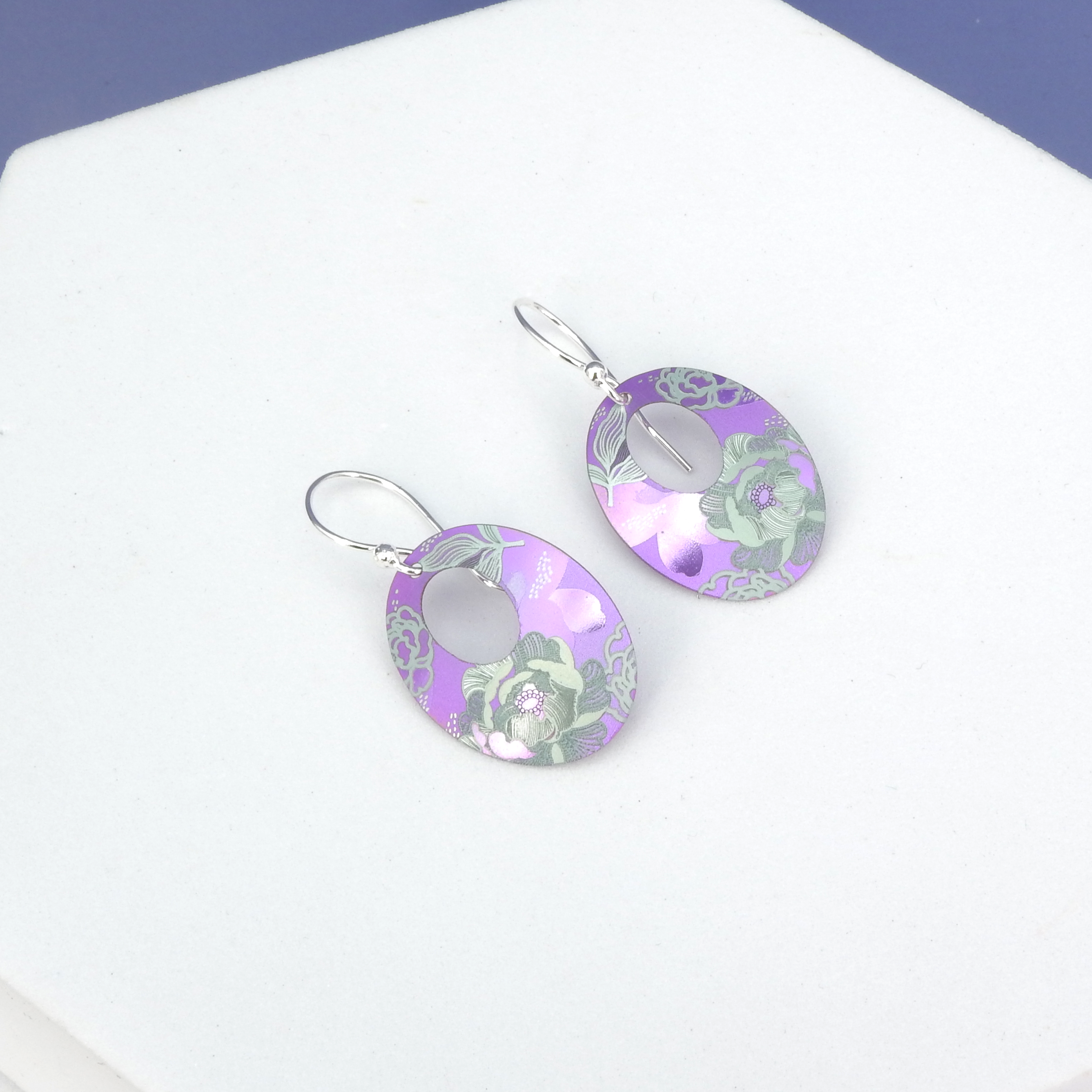 Beautiful purple earrings with etched rose pattern - Super light etched niobium metal - The perfect lavender color - Measures 7/8" long 5/8" wide - Sterling silver ear wires - Created in the USA