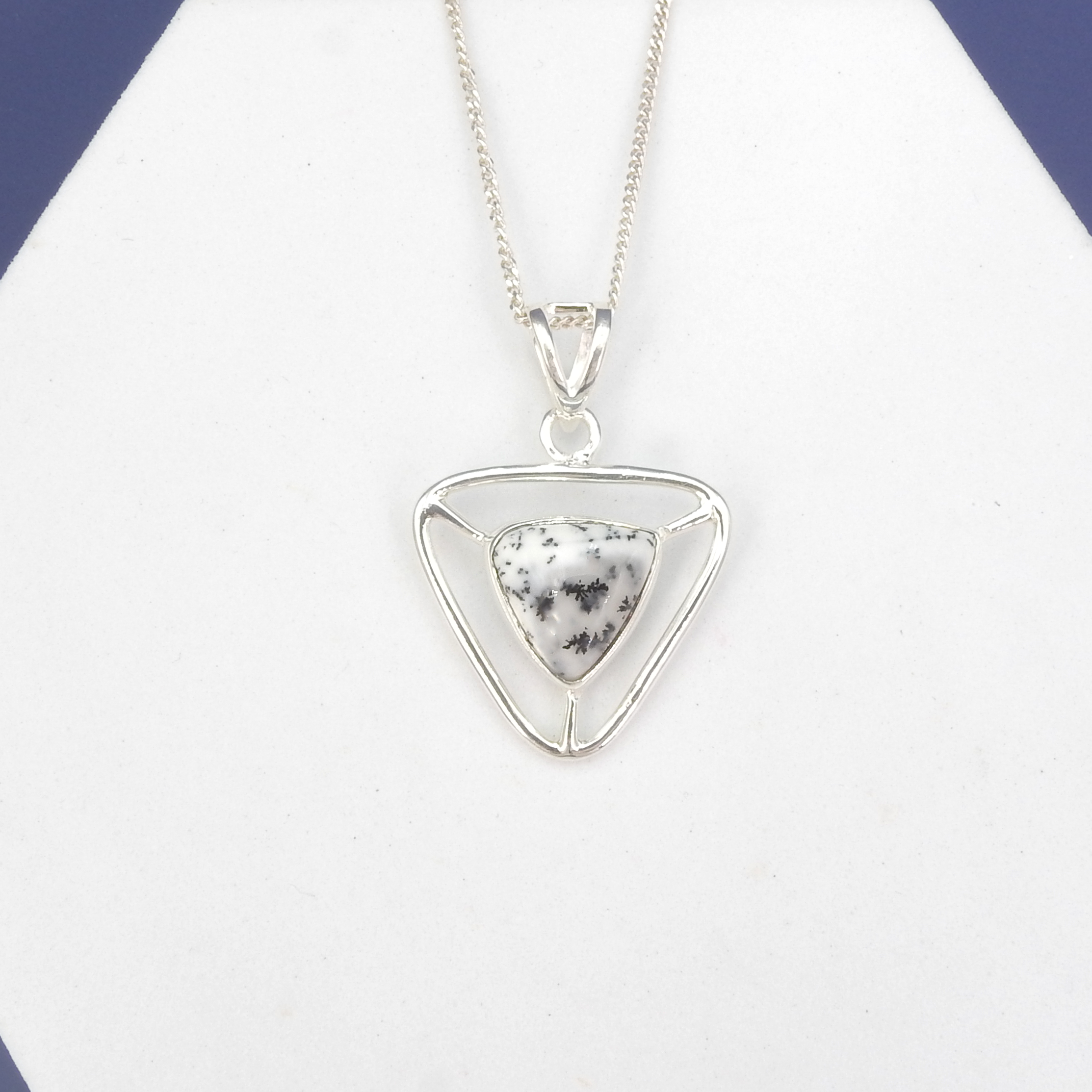Nature's artwork is on display in this pendant - Beautiful dendritic agate is the stone of plentitude - Beautiful coloring in white, grey, and black - Set in sterling silver - Measures 1 1/2" long with bale 1" wide - 18" silver chain included
