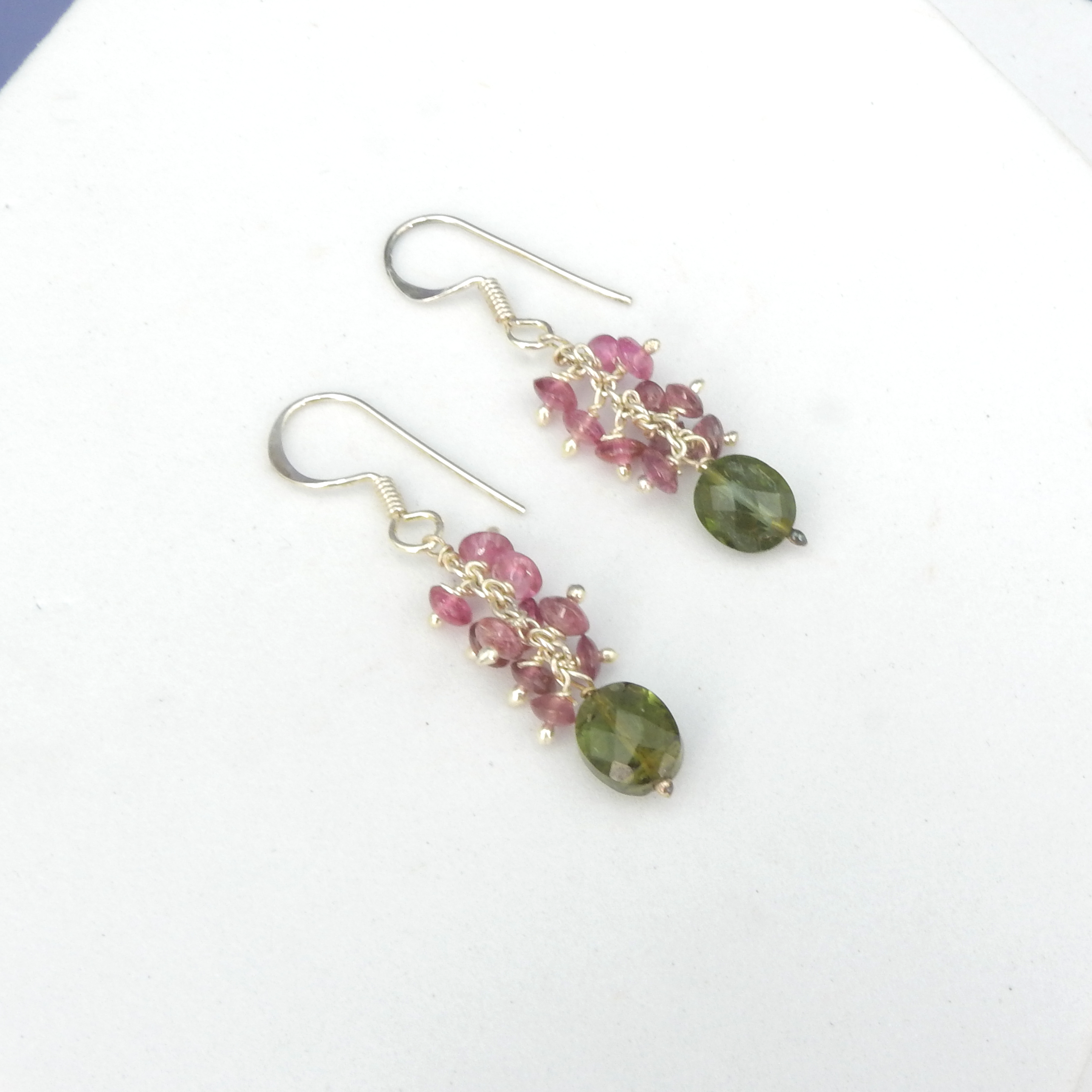 Delicate dangle pinkand green tourmaline earrings - Pink tourmaline beads - Faceted green tourmaline dangle - Sterling silver chain - Measures 1 1/4" long 3/8" wide - Silver fish hook ear wire