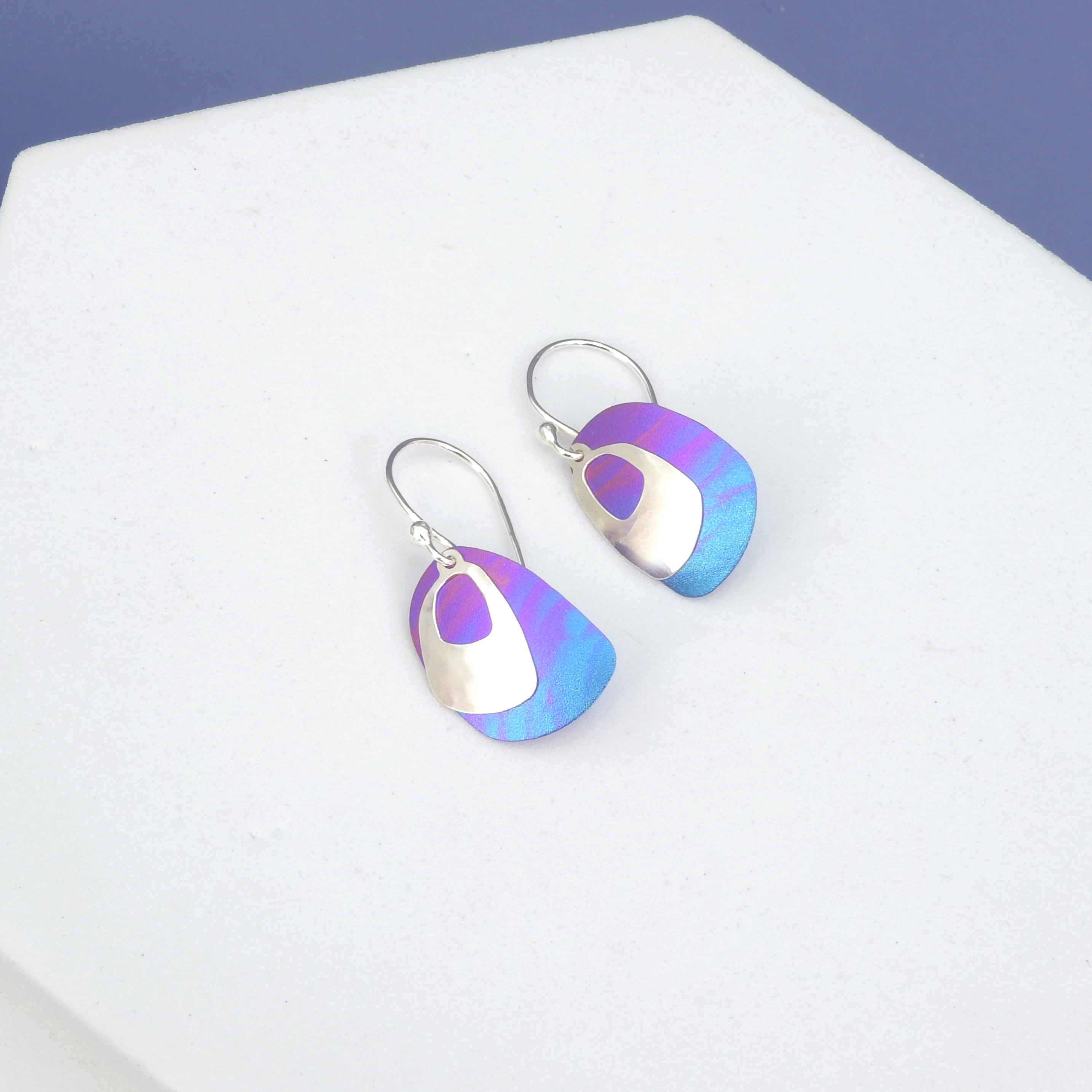 Small, simple and vibrant metal earrings - Vibrant niobium dangle with hammered silver plated metal - Measures 3/4" long 1/2" wide - Sterling silver ear wires - Created in the USA