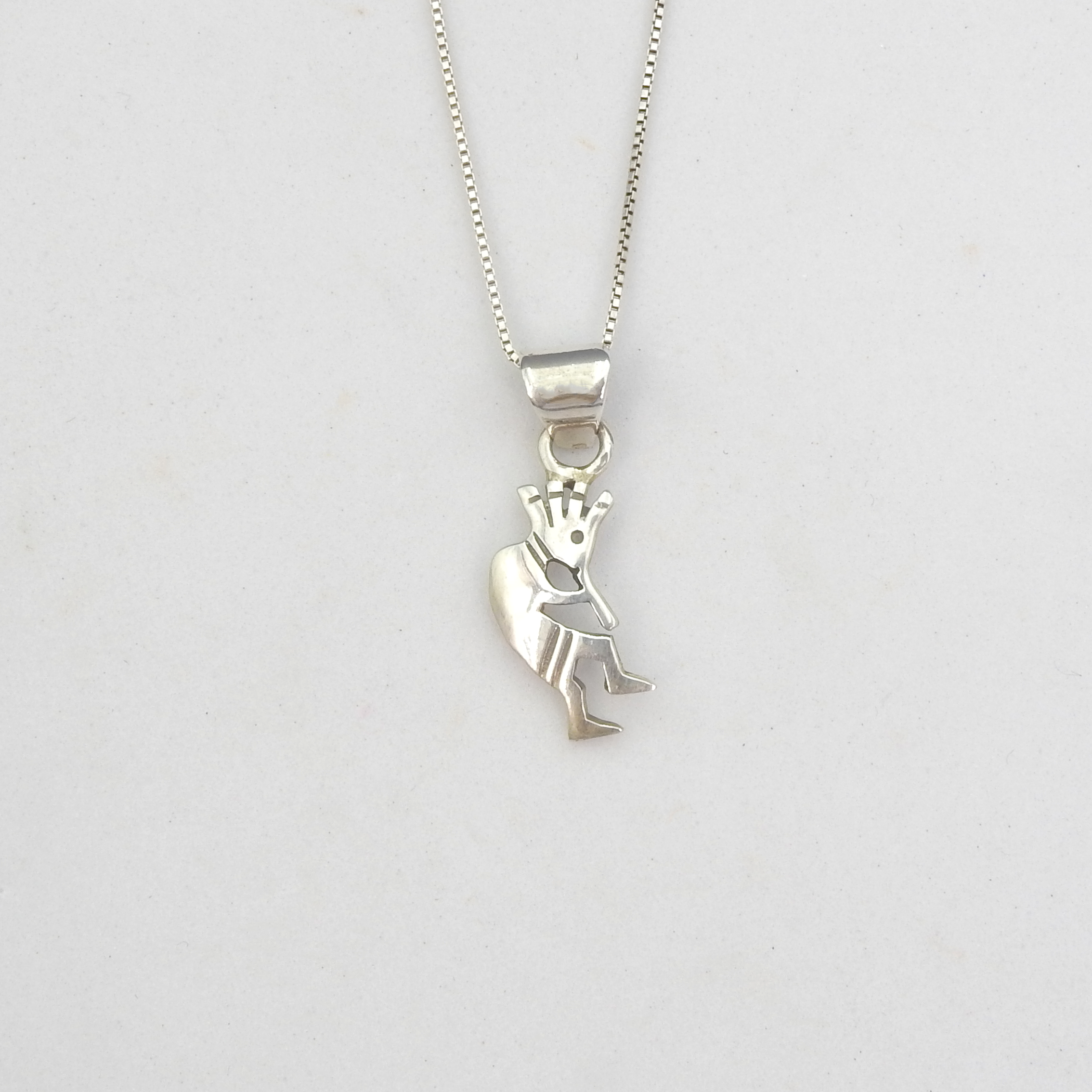 Beautiful Native American made sterling silver small Kokopelli pendant - Sterling silver with oxidized details - Measures 1" long w/ bale 3/8" wide - 16" silver chain