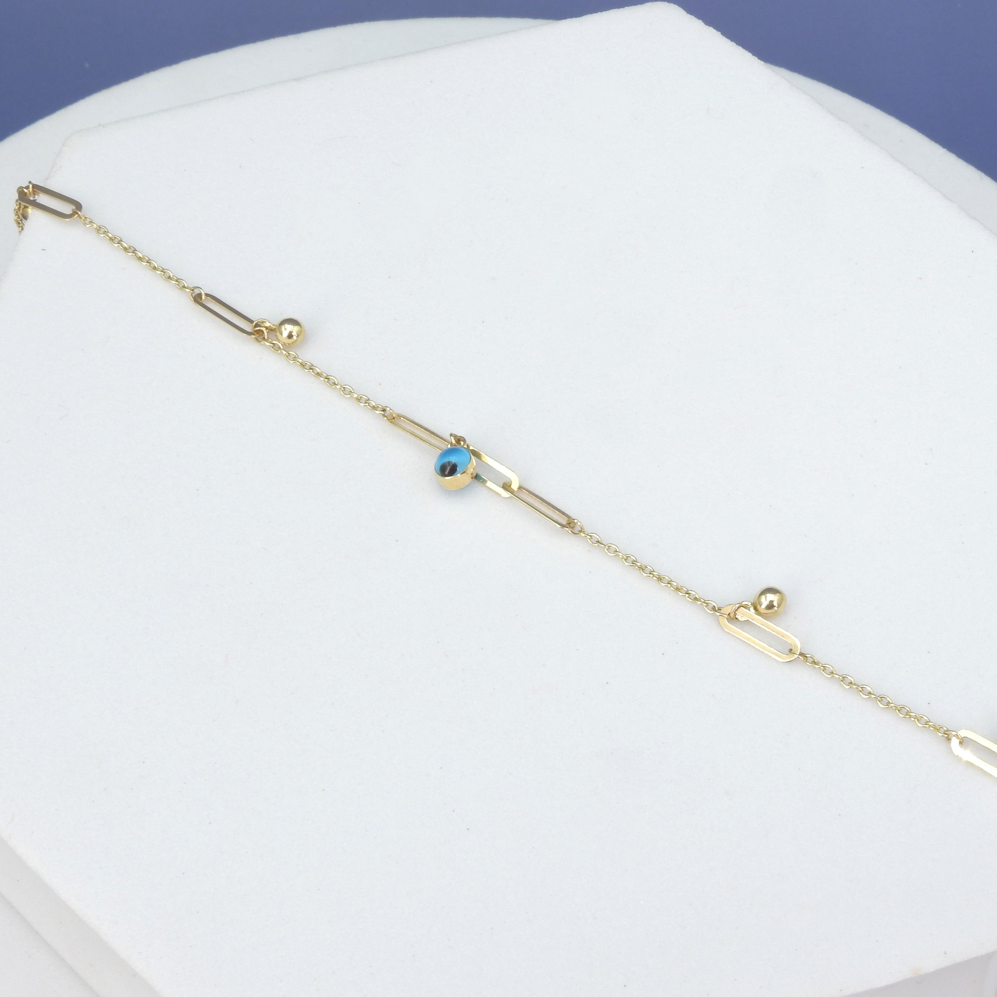 The perfect addition to your everyday bracelet stack. 14KT gold evil eye link and chain bracelet - 14KT yellow gold - Evil eye dangle is glass - 14KT gold ball dangles - Measures 1/8" wide - Lobster clasp. Adjustable from 6 1/2" - 7" long