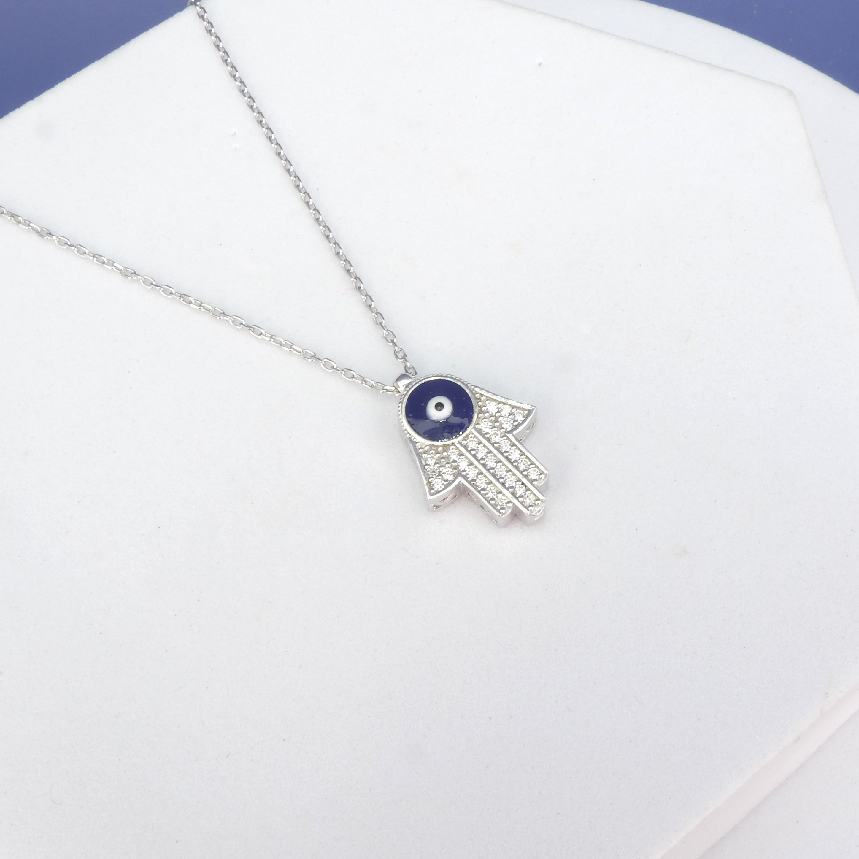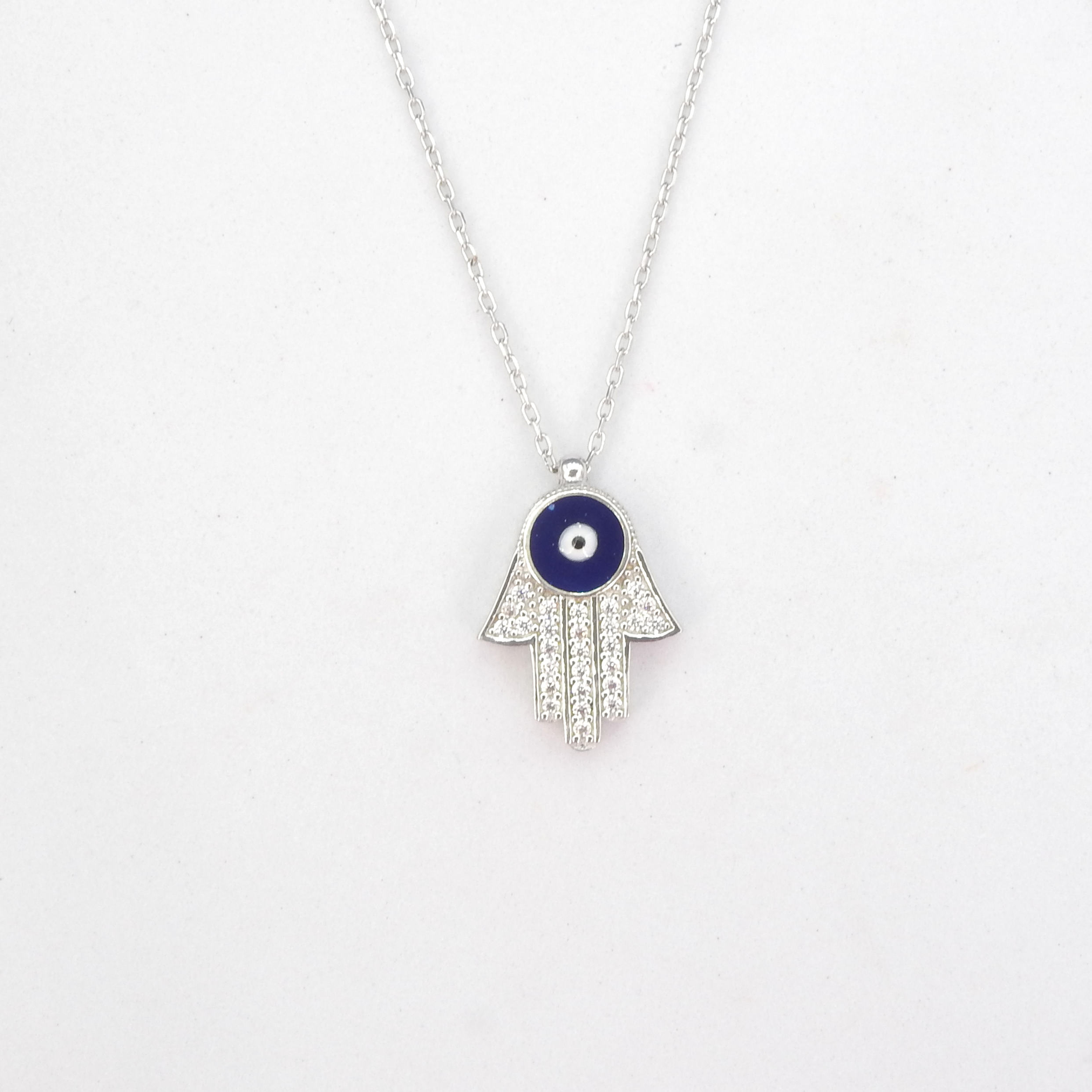 Lovely Hamsa necklace with CZ stones with an enamel eye in the center - Sterling silver - CZ - Enamel - Perfect for layering - Measures 7/8" long 5/8" wide - Adjustable from 16" - 18"