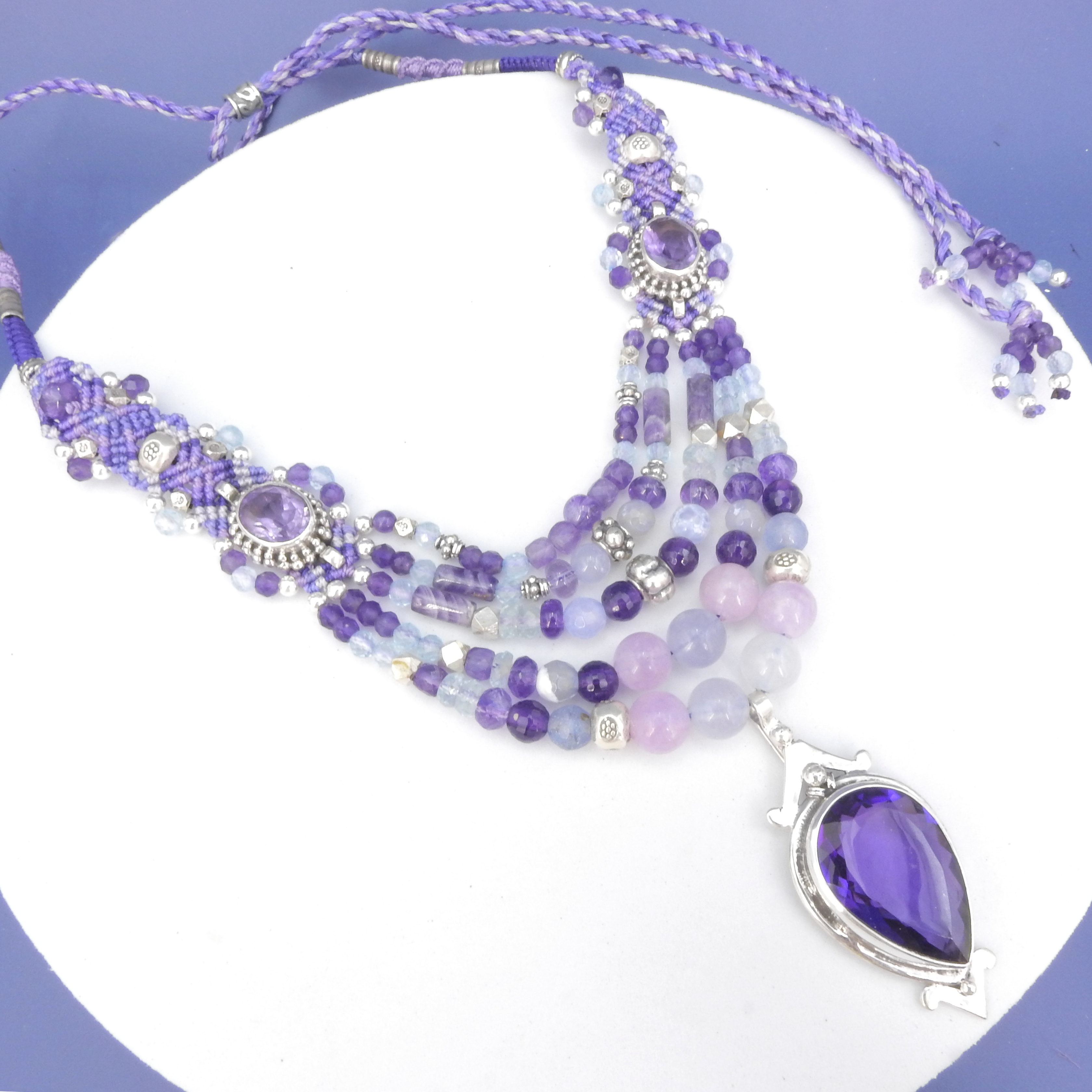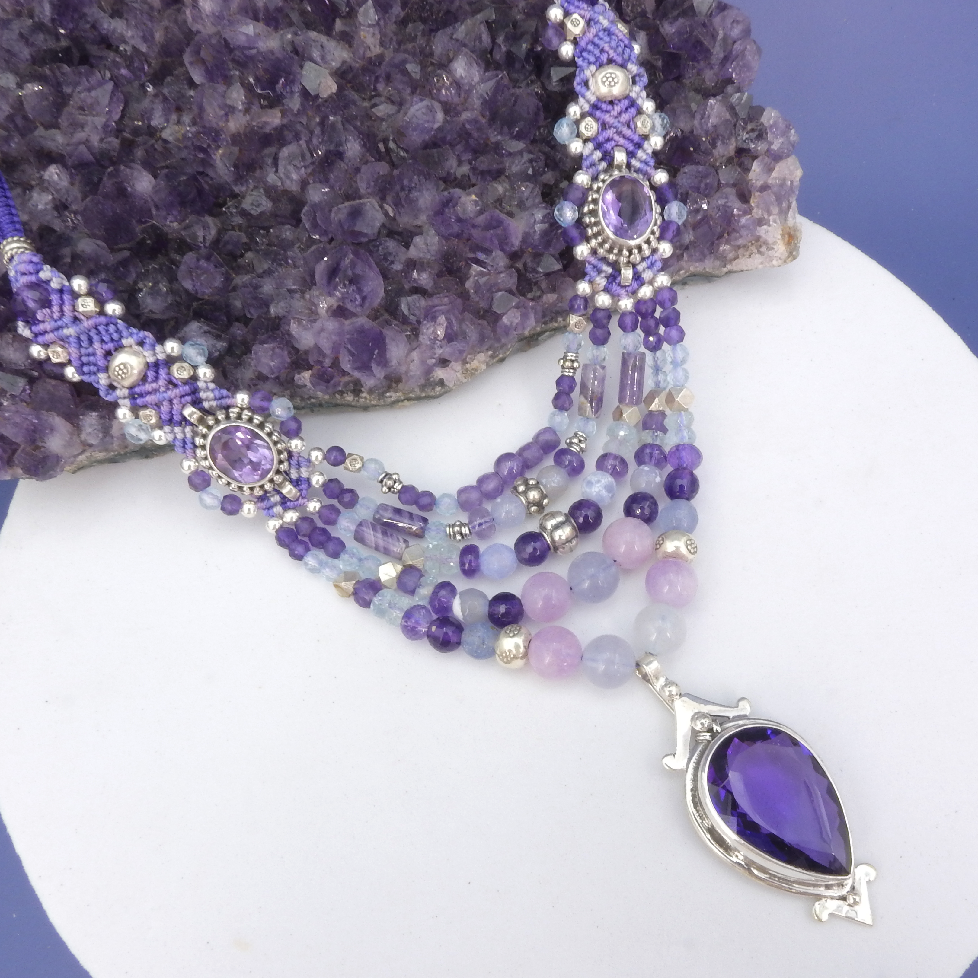Handmade one-of-a-kind beautiful statement multi strand knotwork necklace - Focal large faceted amethyst dangle in silver setting - Multi strands of gemstones topped with amethyst - Beads of amethyst, rose quartz, quartz and silver - Focal amethyst dangle measures 2" x 7/8" - Adjustable to 26” long - Durable and hand washable using a toothbrush and mild soap