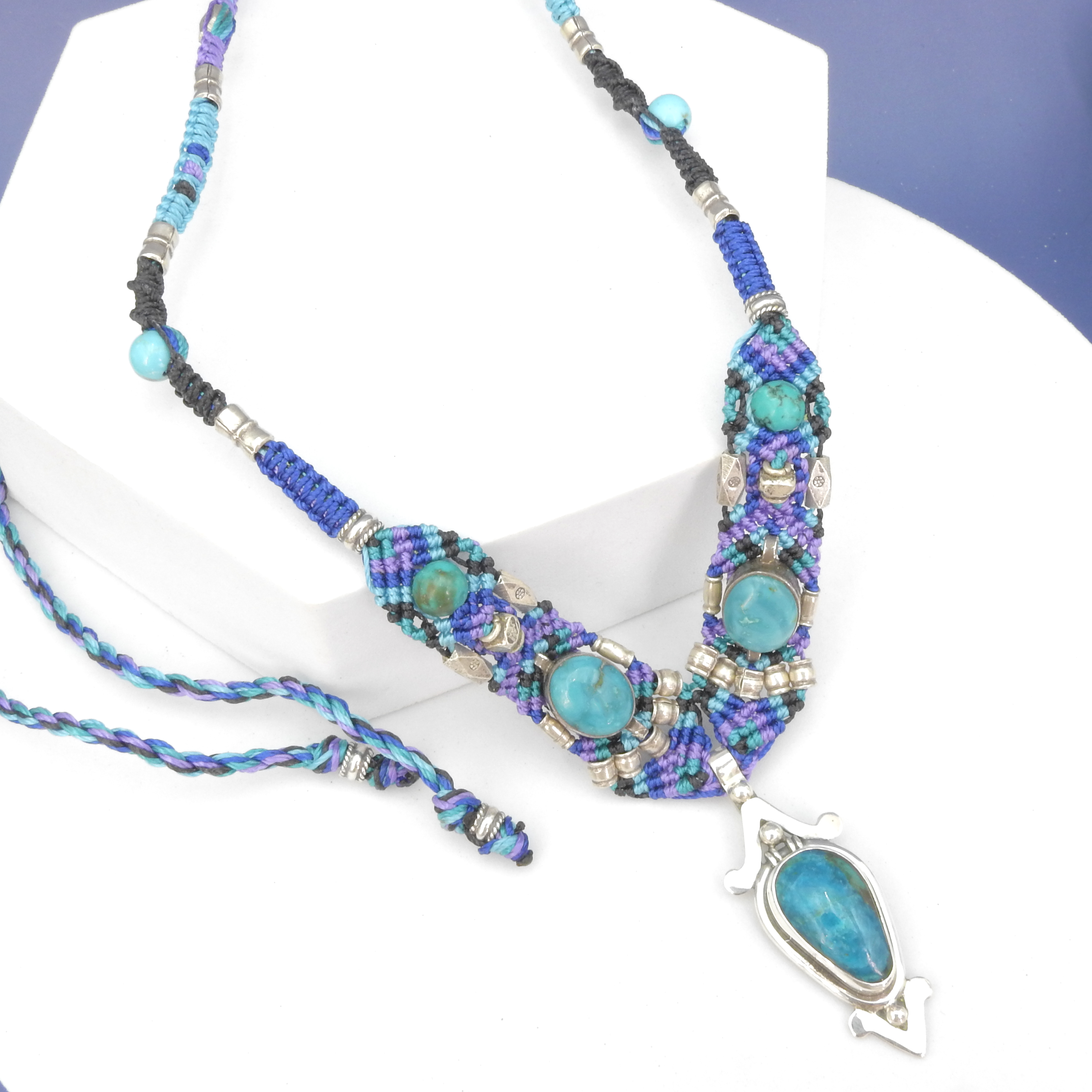 Handmade one-of-a-kind stunning knotwork necklace Gorgeous deep blue and purple threads highlight the stones - Chrysocolla dangle set in sterling silver - Beads of chrysocolla, turquoise & silver are woven in - Center dangle measures 1 5/8" x 3/4" - Adjustable to 26” long - Durable and hand washable using a toothbrush and mild soap