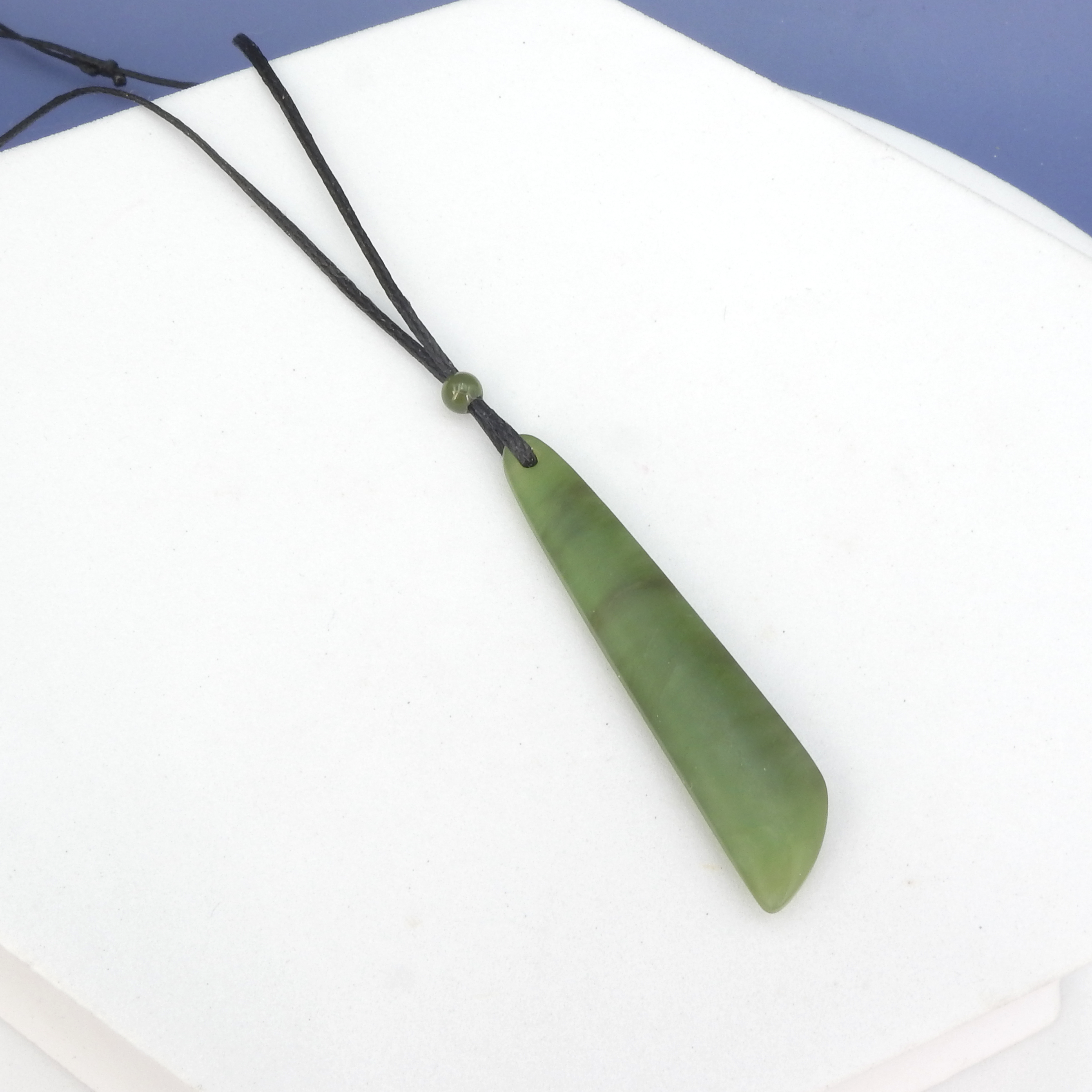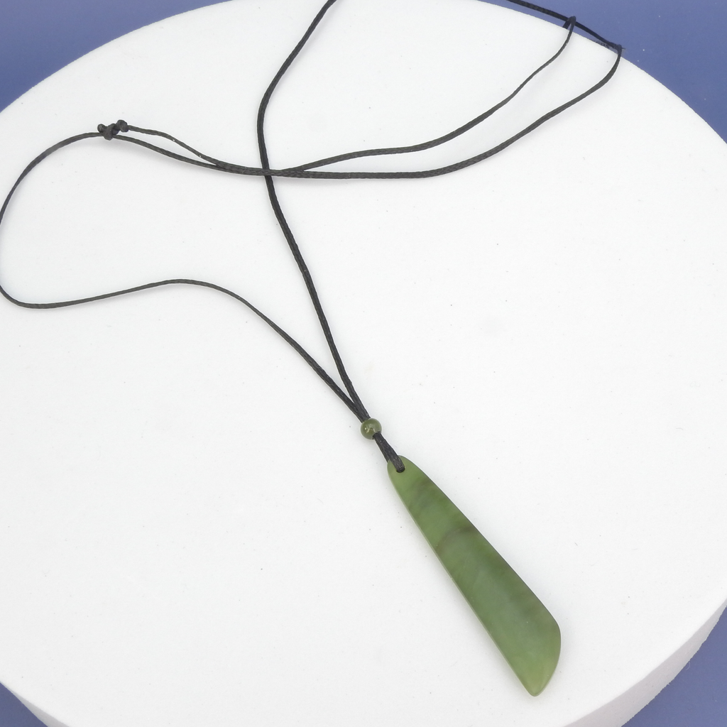 Jade long drop pendant. Unisex design on braided cord - Sold jade long drop - On adjustable cord - Jade measures 2" long x 3/8" wide - Adjustable to 24” long - Canadian jade