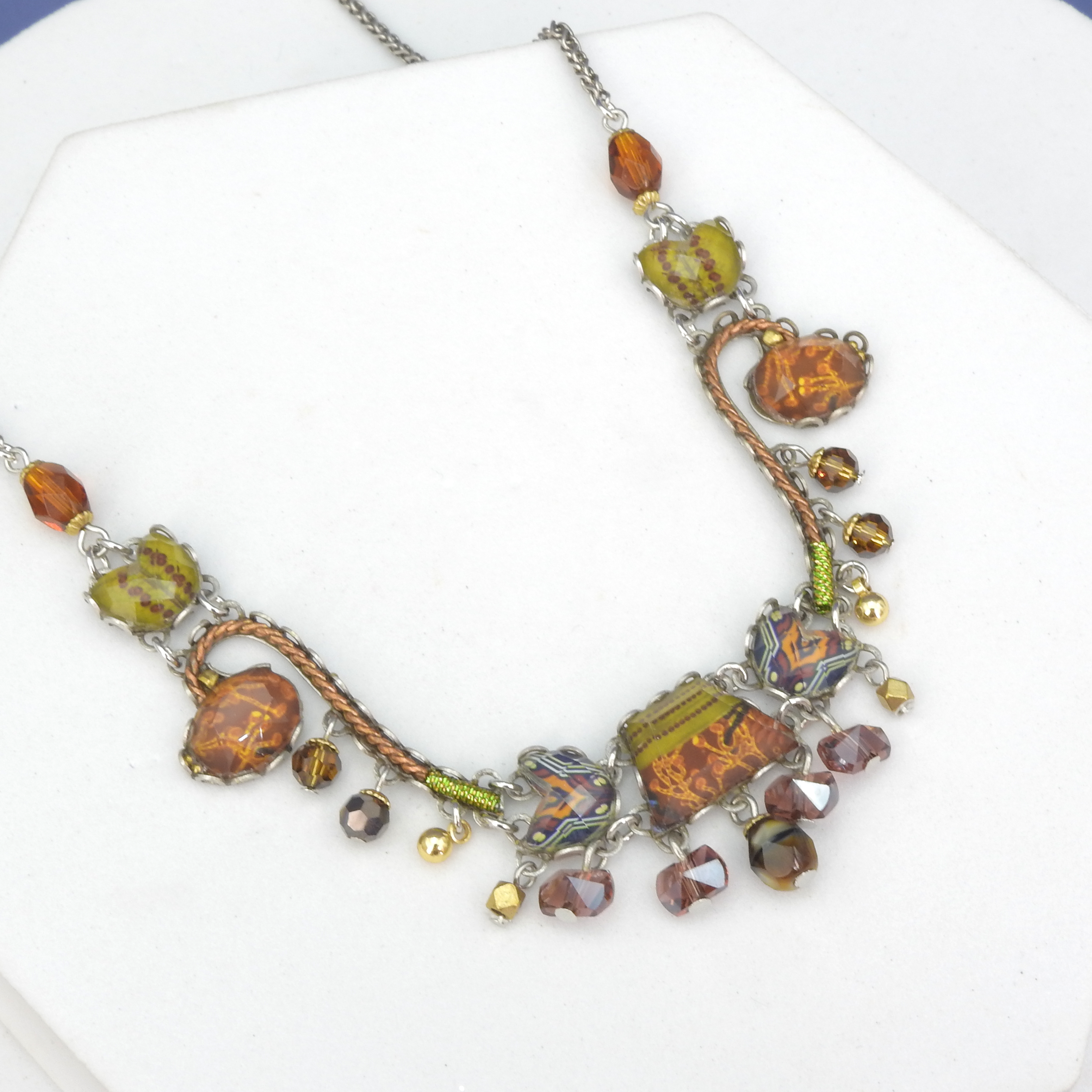 This Golden Dunes necklace is wearable art - Silver plated brass and metal alloys - Glass, crystals, and fabric - 5 1/2" of decoration - Adjustable 15" - 18" long - Hypoallergenic Handmade in Israel