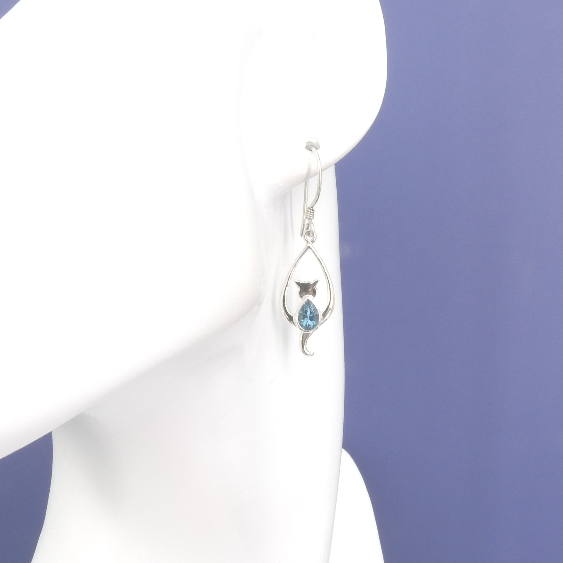 Sterling silver adorable gemstone cat dangle earrings - Faceted garnet or blue topaz - Sterling silver - Measures 1" long 1/2" wide - Fishhook ear wires Choose garnet or blue topaz