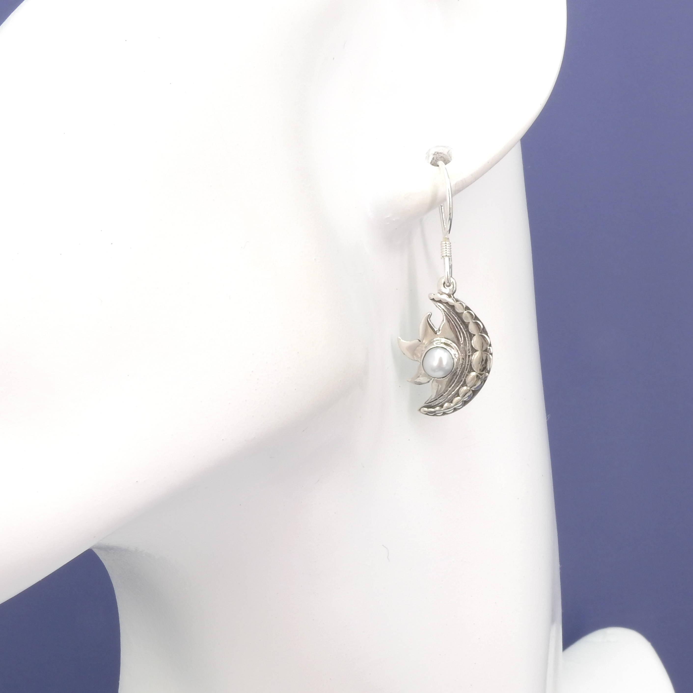 Pretty whimsical sun and moon pearl earrings - Pearl - Sterling silver with oxidized details - Measures 7/8" long 1/2" wide - Fishhook ear wires