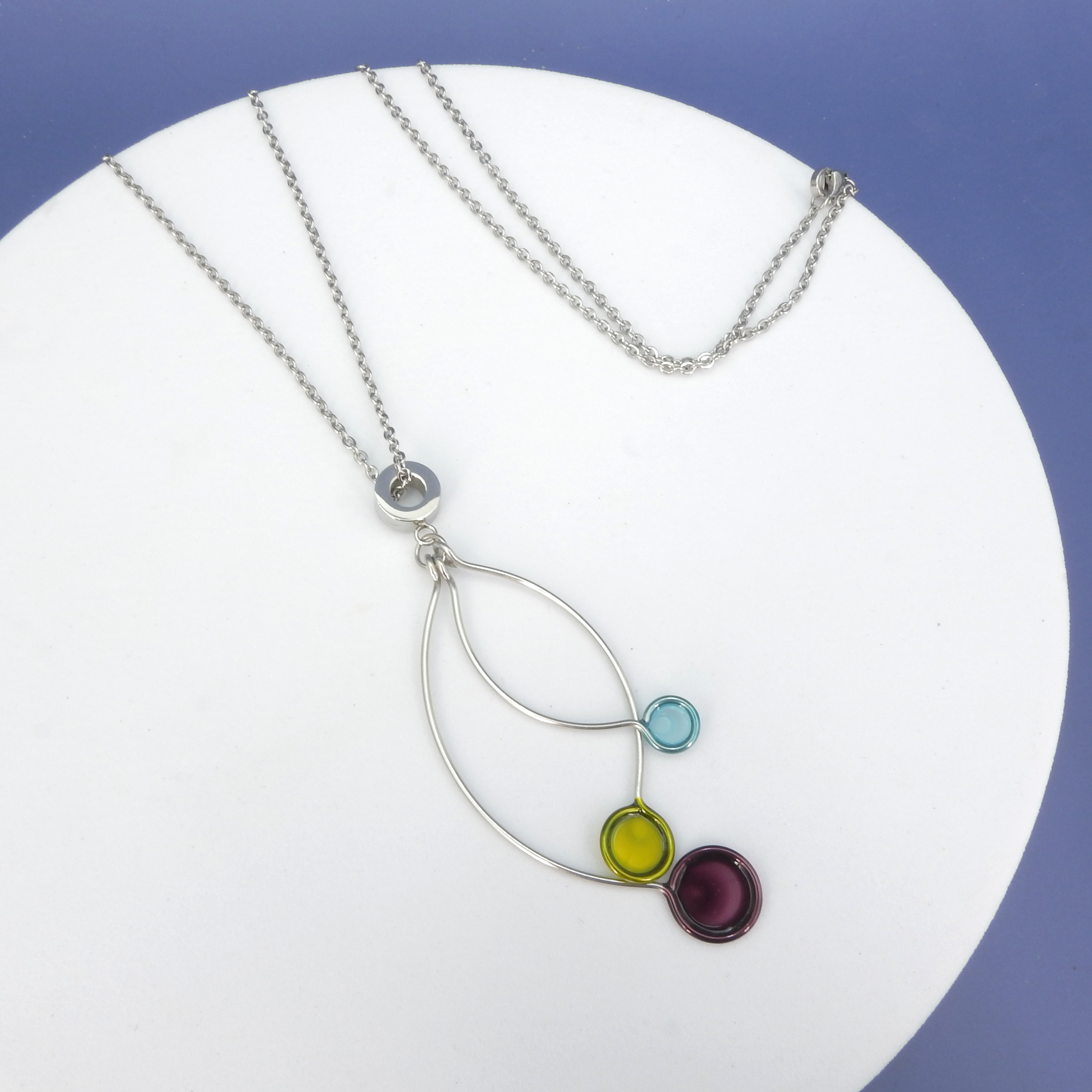 Art to wear kinetic jewelry - Playful and sophisticated - Stainless steel dipped in colorful resin - Pendant is 3" long 1" wide - Stainless steel chain is 24" long