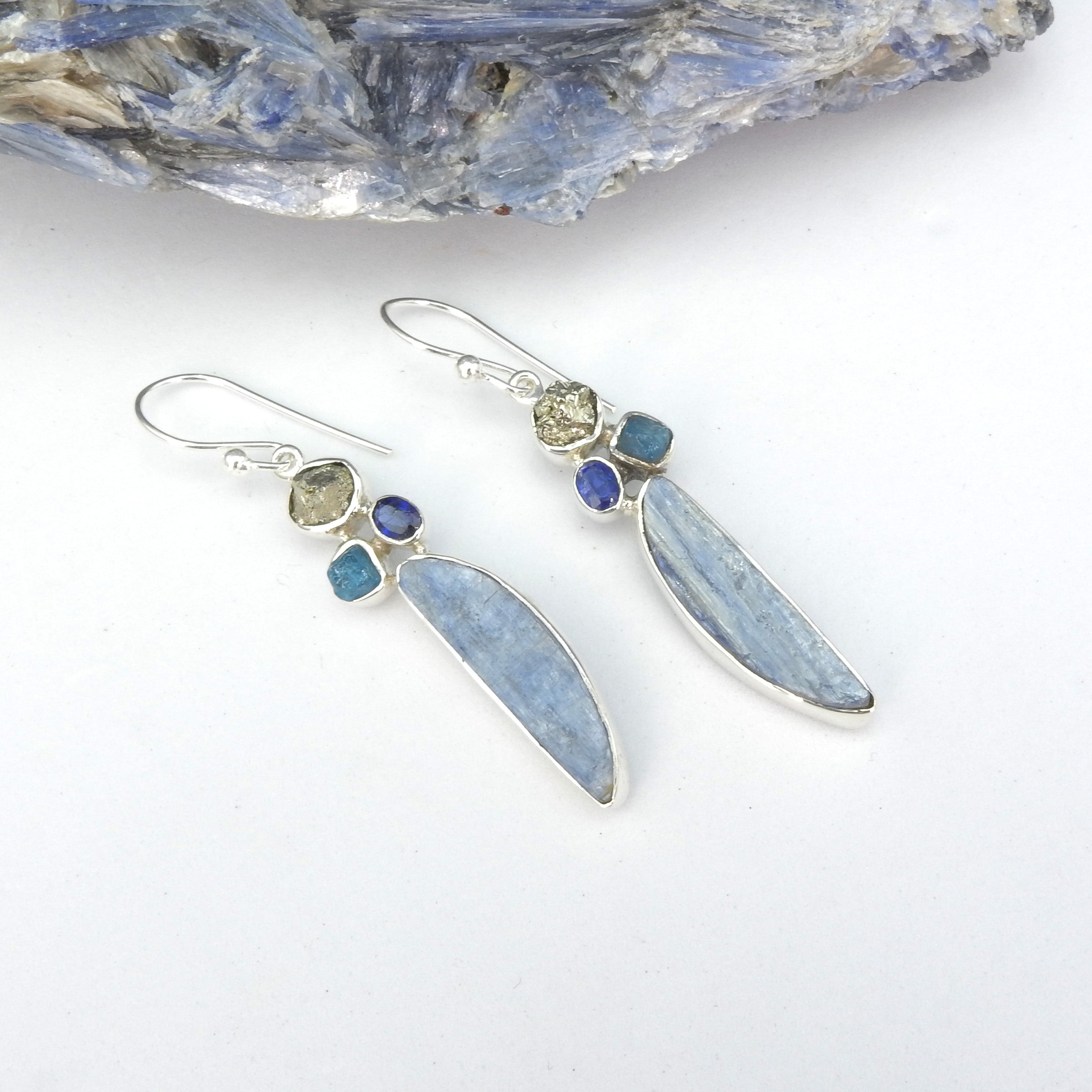 Elegant rough kyanite earrings - Rough and faceted kyanite - Rough pyrite and apatite - Set in sterling silver - 1 1/2" long 1/4" wide - Silver fishhook ear wire