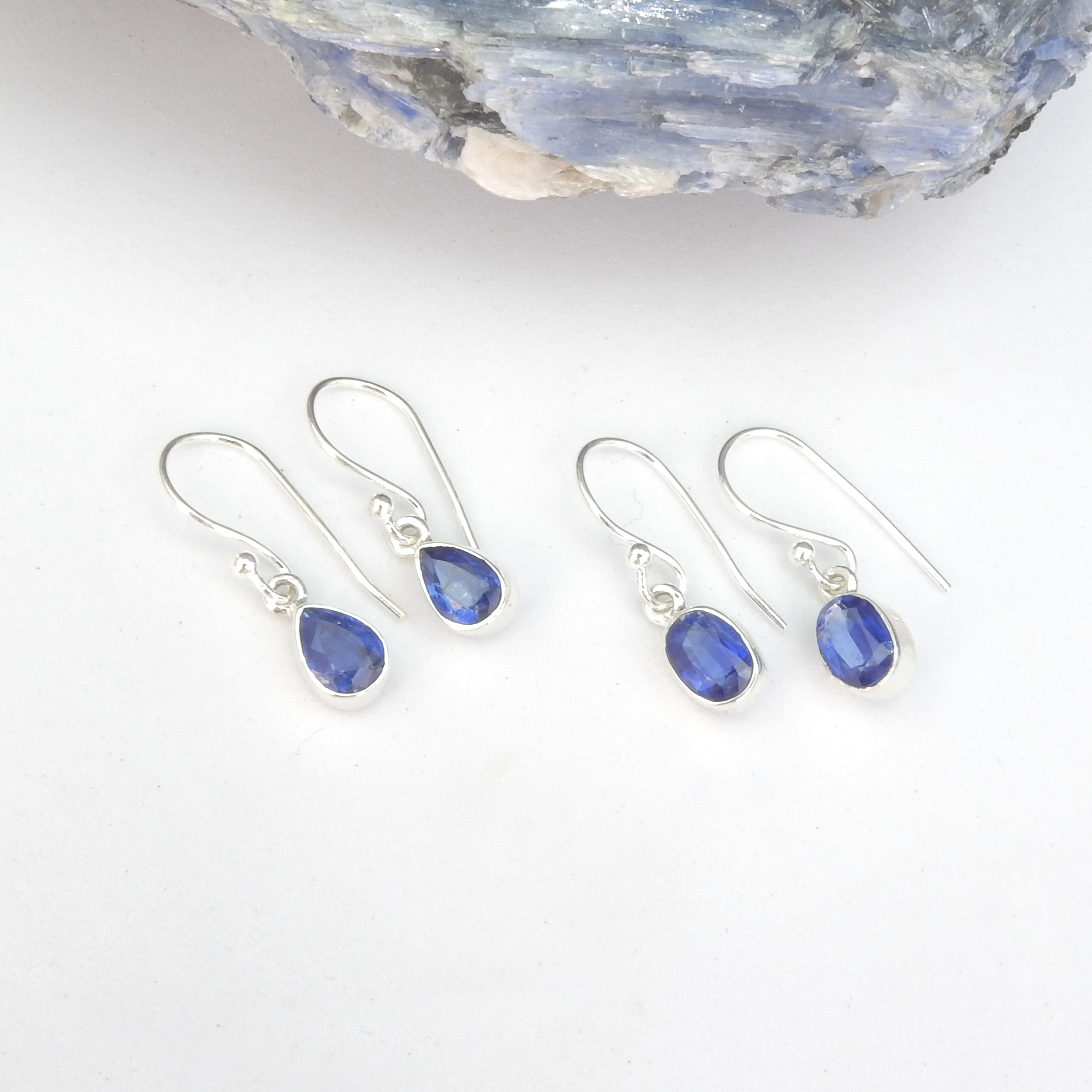 Beautiful small faceted kyanite earrings - Faceted kyanite - Set in sterling silver - Measures 1/4" long x 1/4" wide - Fishhook ear wire Choose between oval or teardrop style