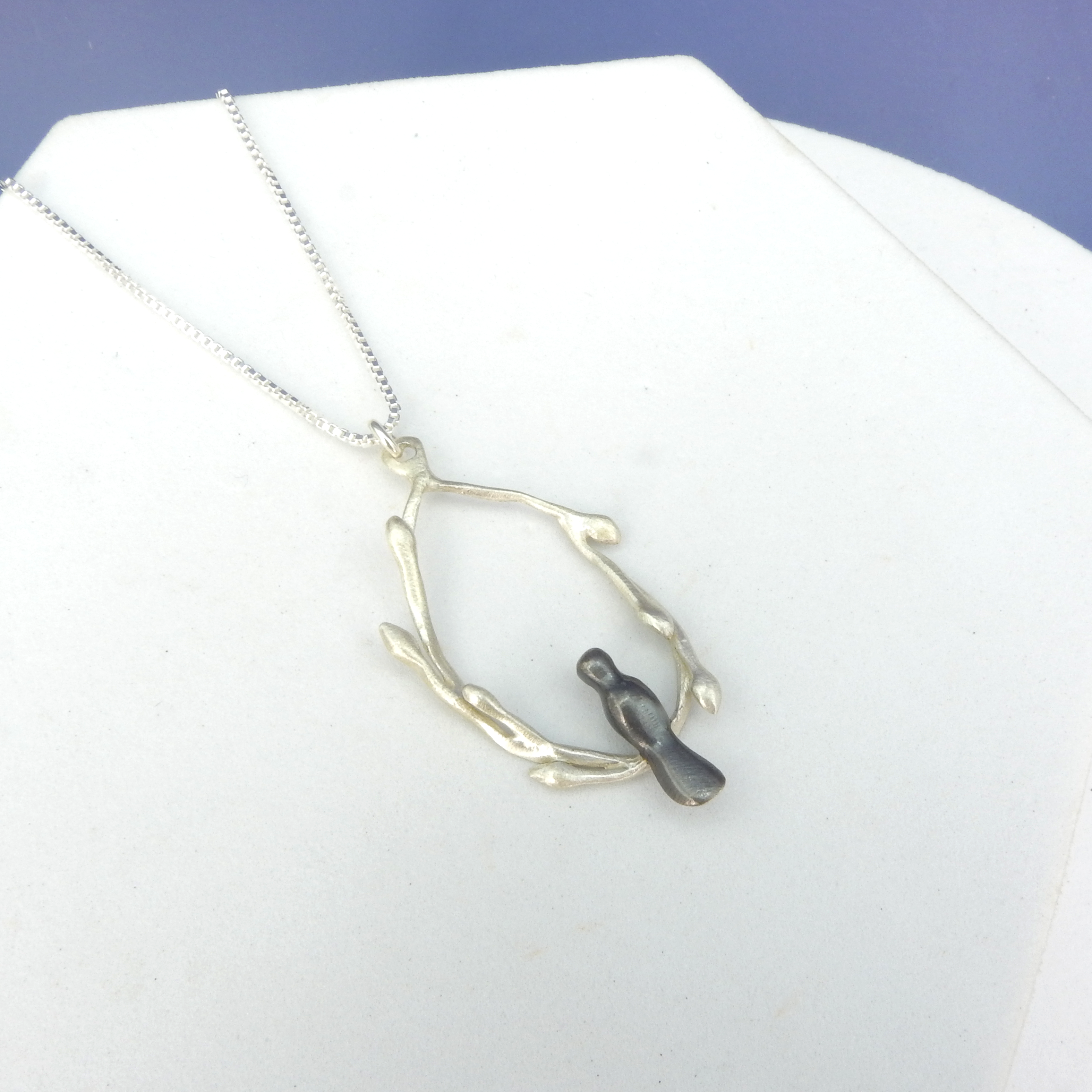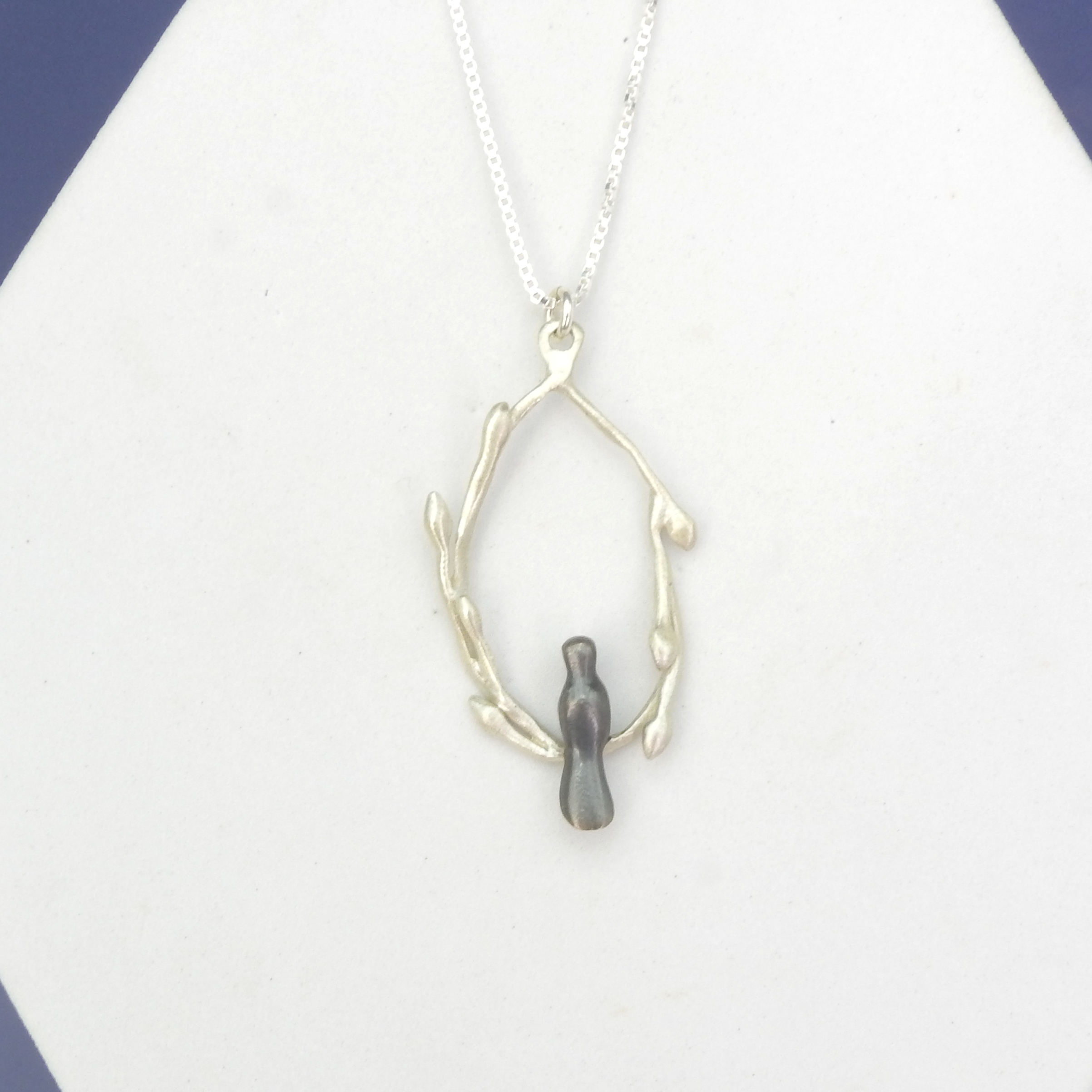 This playful collection by Lisa Cimino is inspired by nature. Delicate birds are swinging from an oval branch - Sterling silver, birds are finished in black - Measures 1 3/4" long 7/8" wide - 18" silver chain - Handmade in the USA