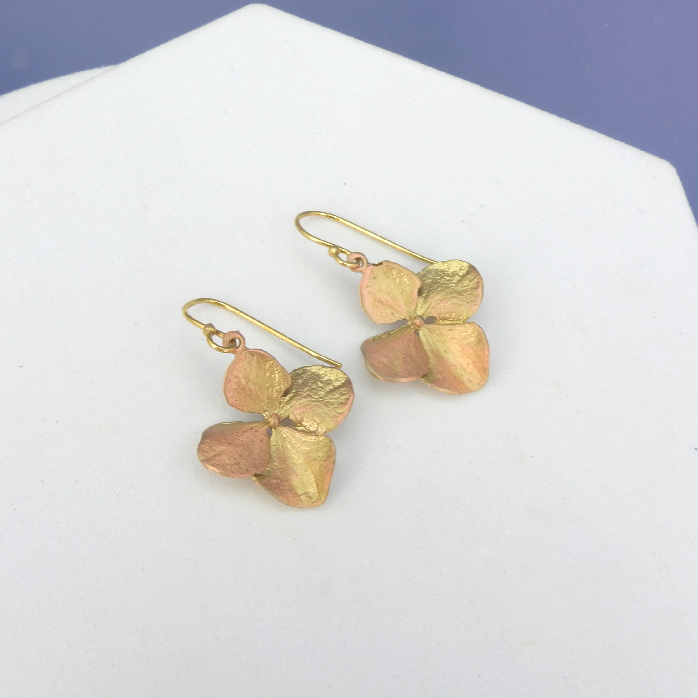 Pretty and simple hydrangea flower earrings - Cast bronze - Gold with light pink - 7/8" long 3/4" wide - Fish hook ear wire