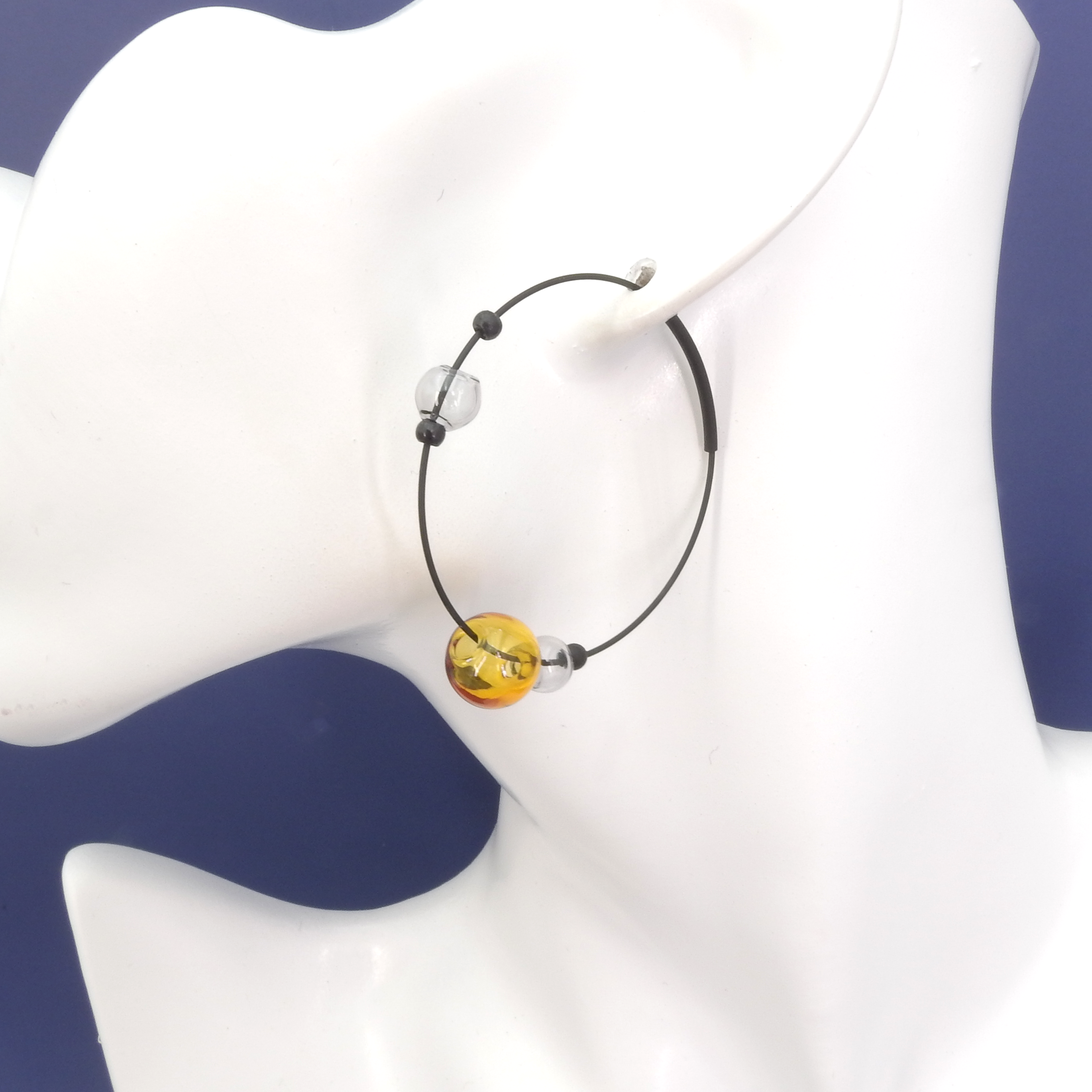 Black Wire Amber & Grey Glass Hoop Earrings