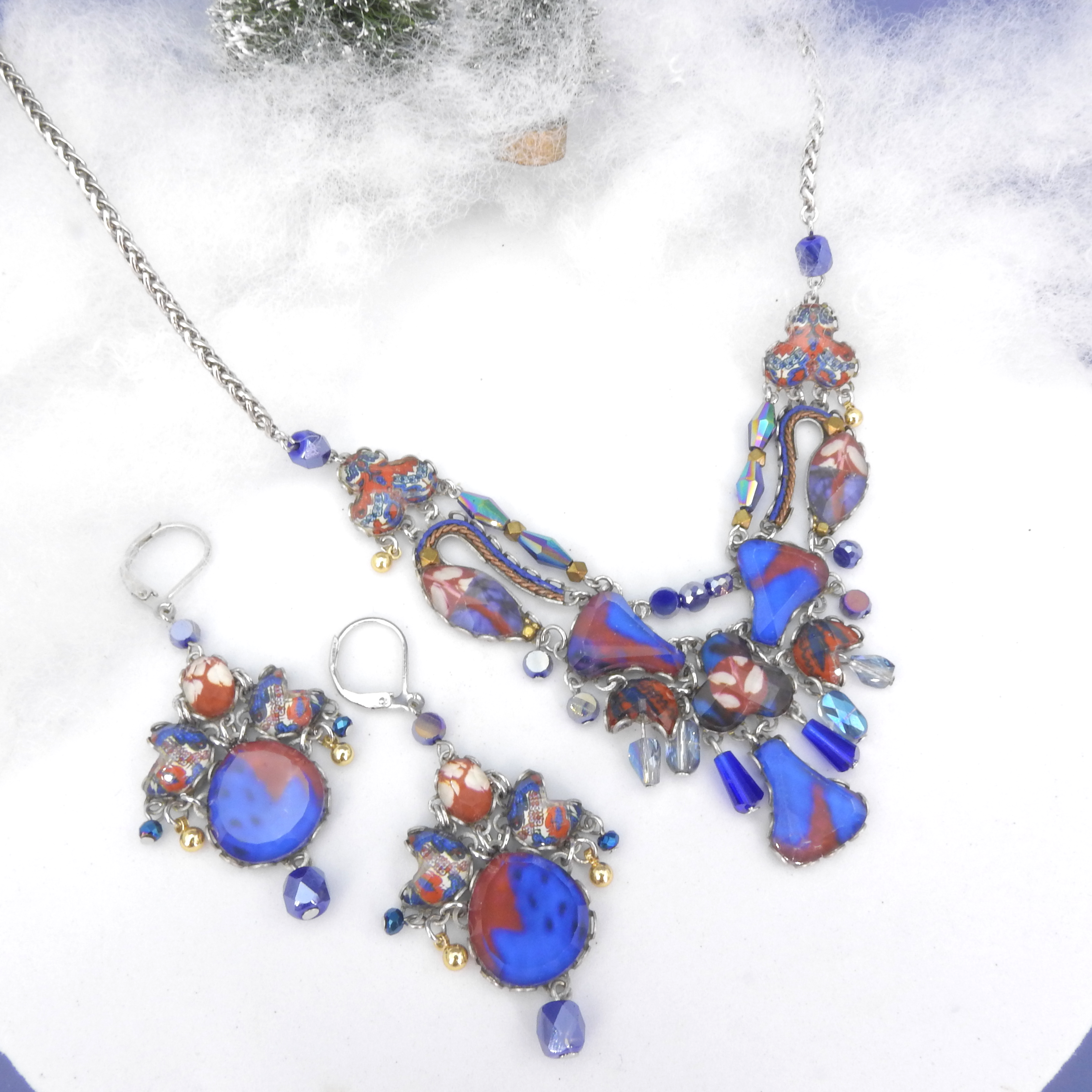 This Ocean Edge statement necklace is wearable art - Silver plated brass and metal alloys - Glass, crystals, and fabric - 5" of decoration - Adjustable 15" - 18" long - Hypoallergenic Handmade in Israel