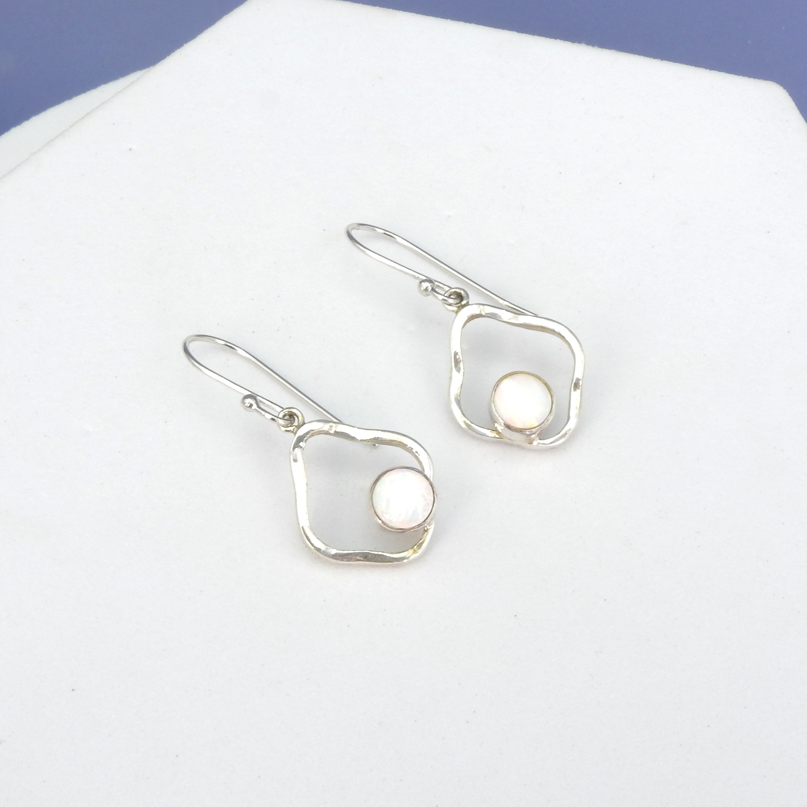 Lovely free form sterling silver earrings with created opal centers - Sterling silver - Created opal - Measures 3/4" long 5/8" wide - Fish hook ear wires