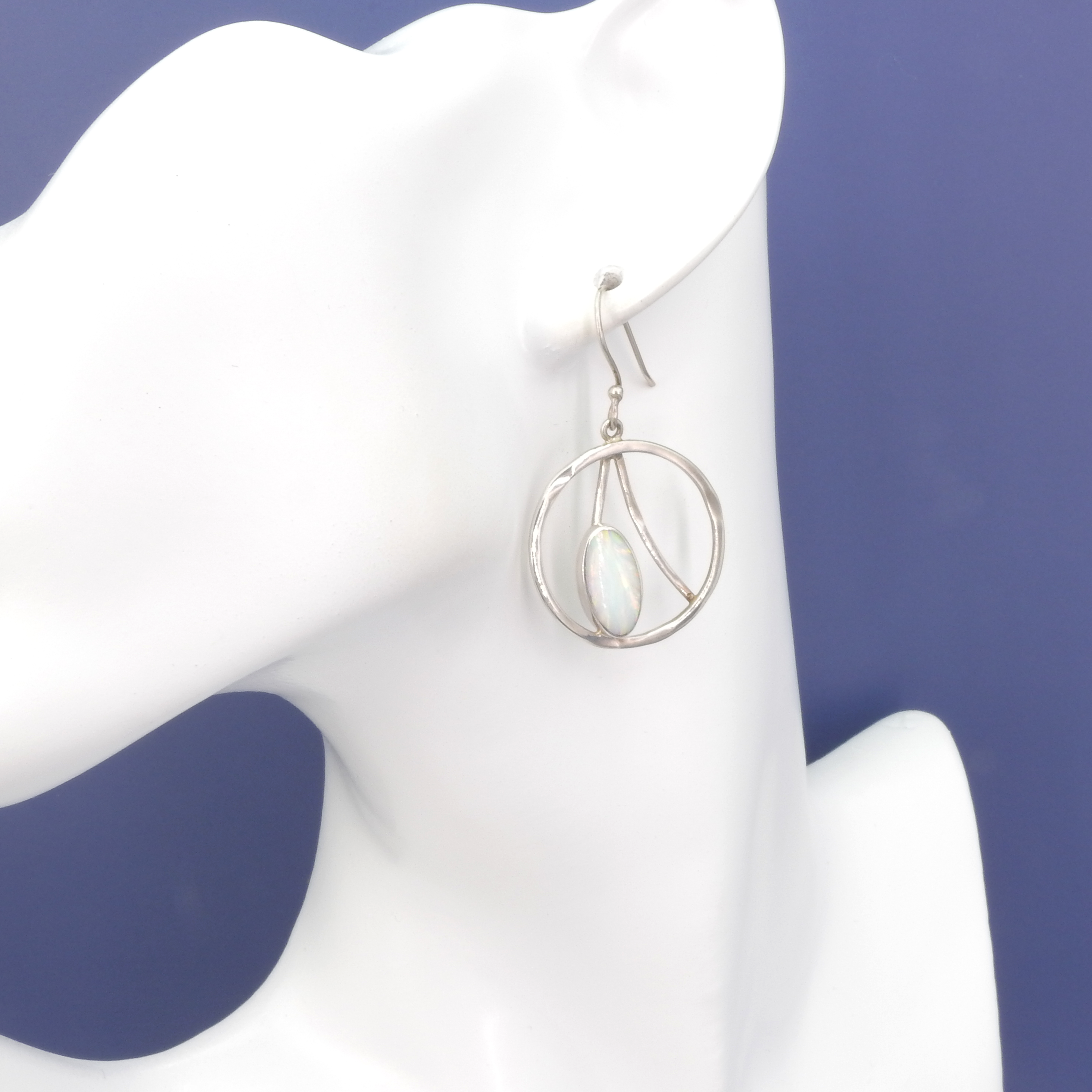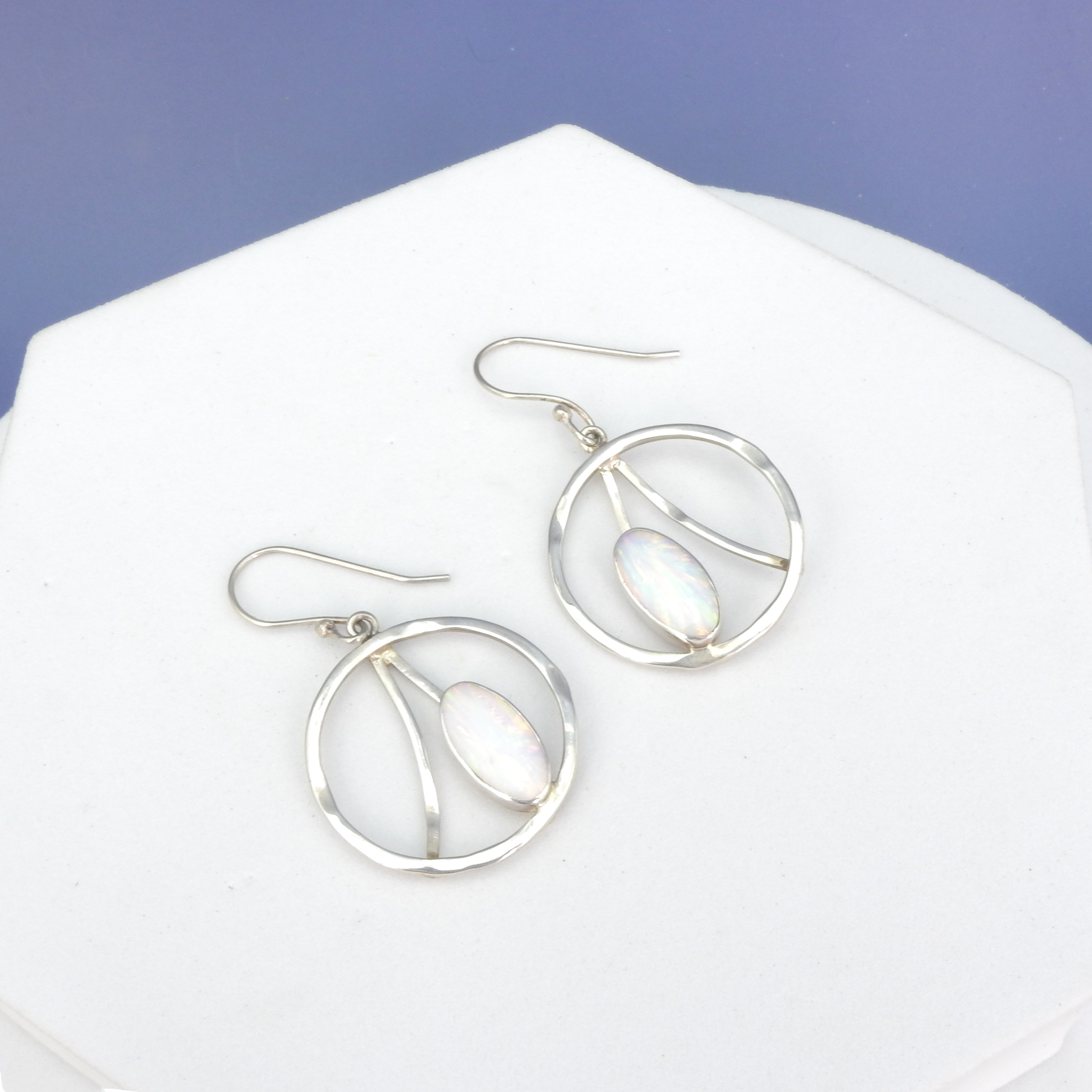 Lovely round sterling silver earrings with created opal centers - Sterling silver - Created opal - Measures 1" in diameter - Fish hook ear wires