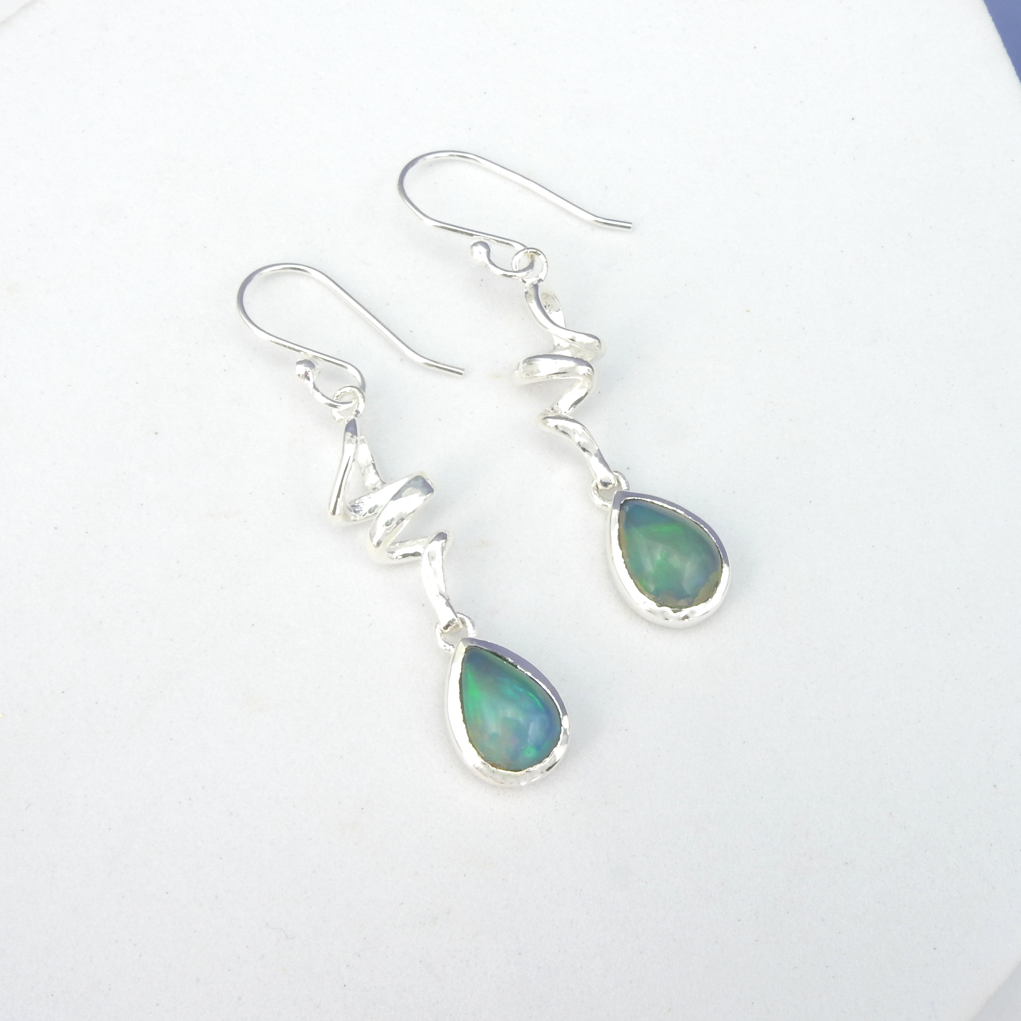 Long silver twisted Ethiopian opal earrings - Ethiopian opal - Sterling silver - Measures 1 1/4" long 3/8" wide - Fishhook ear wires