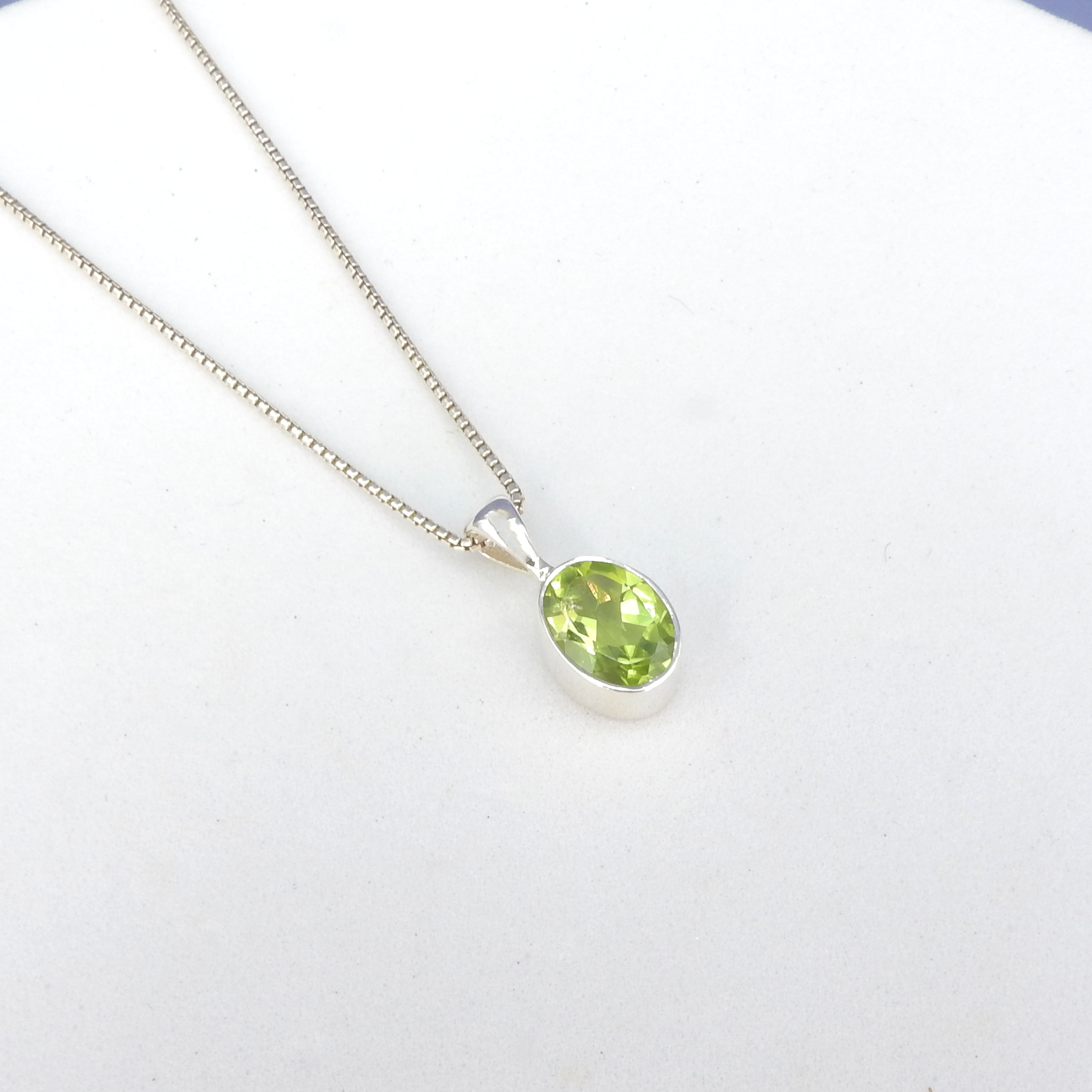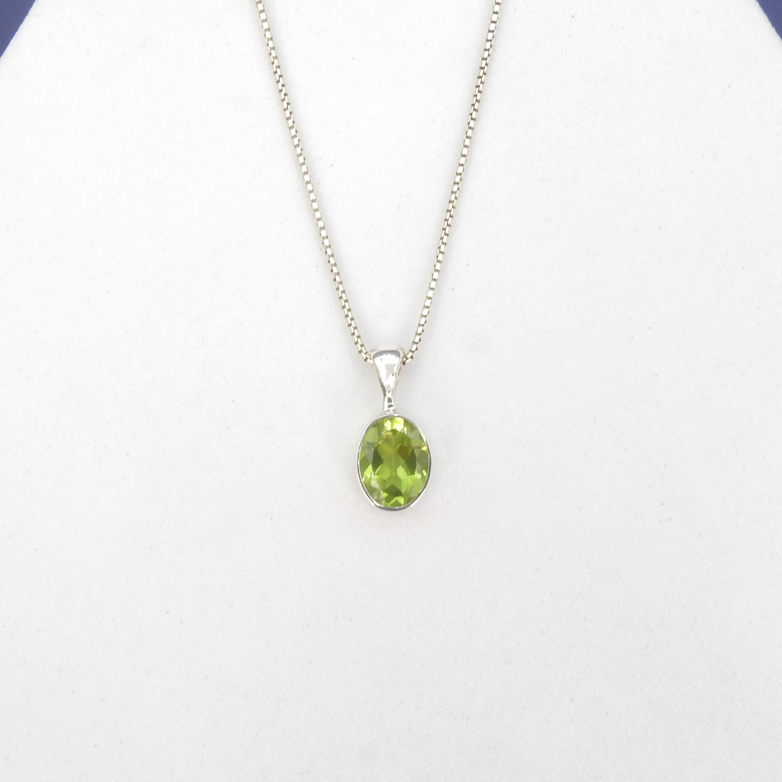 Simple but elegant, single faceted small peridot oval pendant. Layer or wear alone. - Set in sterling silver - 5/8" long with bale 1/4" wide - 18" silver chain