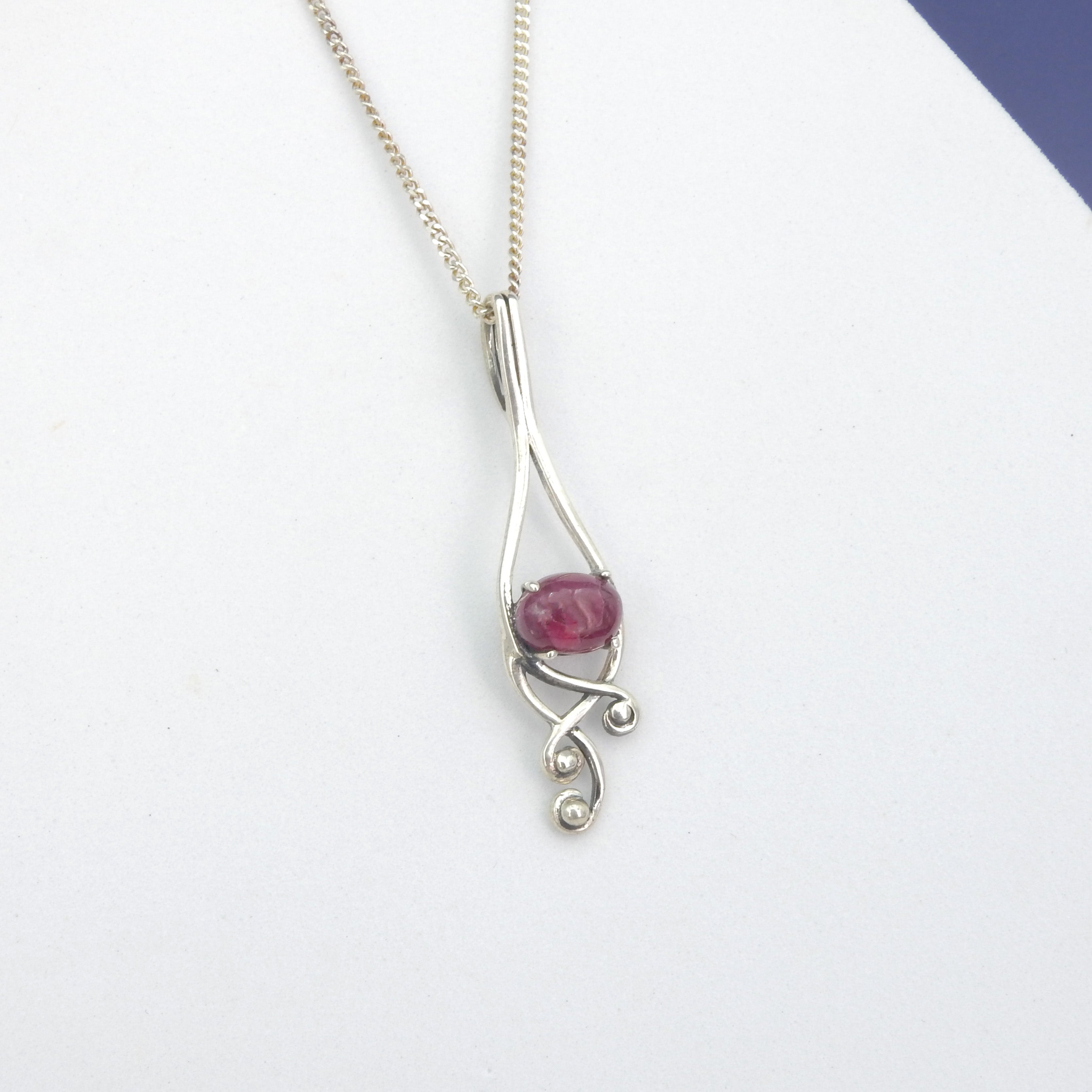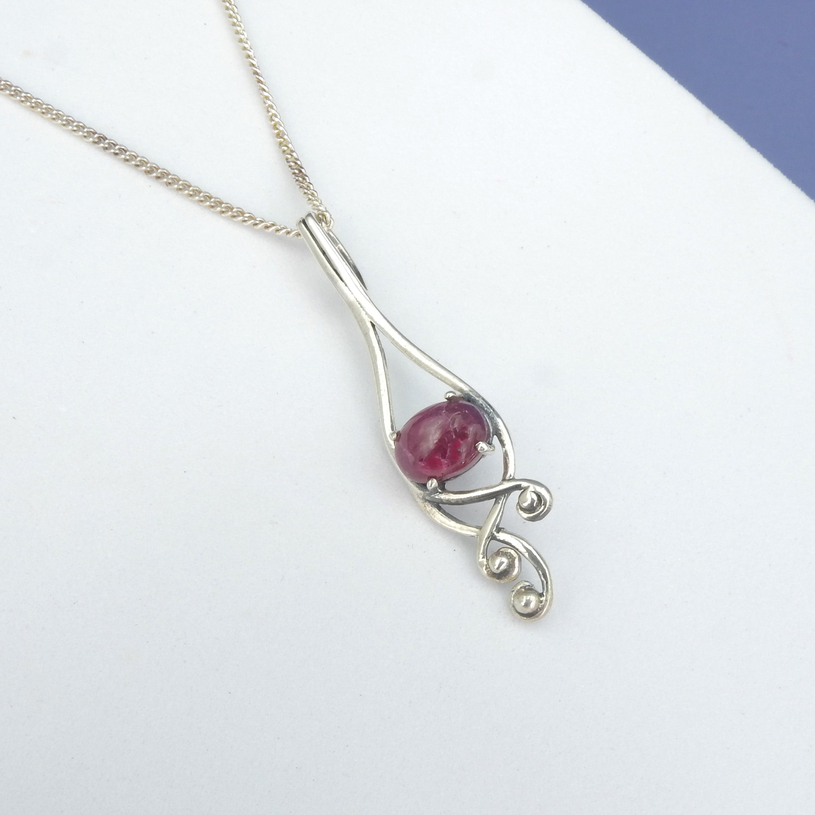 Smooth ruby pendant with decorative details - Sterling silver - Smooth ruby - Measures 1 5/8" long with bale 3/8" wide - 18" silver chain included