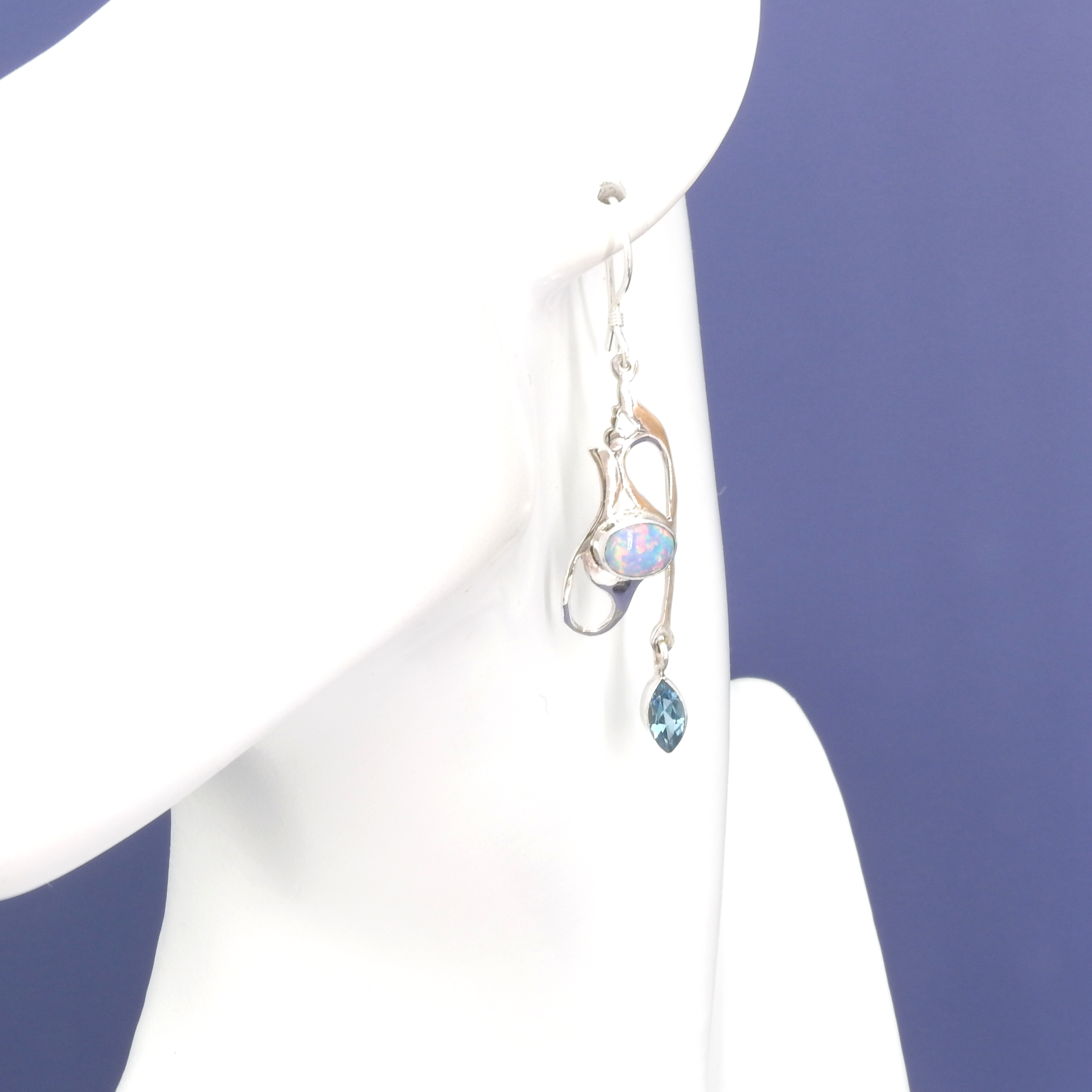 Sterling Silver Long Created Opal & Blue Topaz Earrings