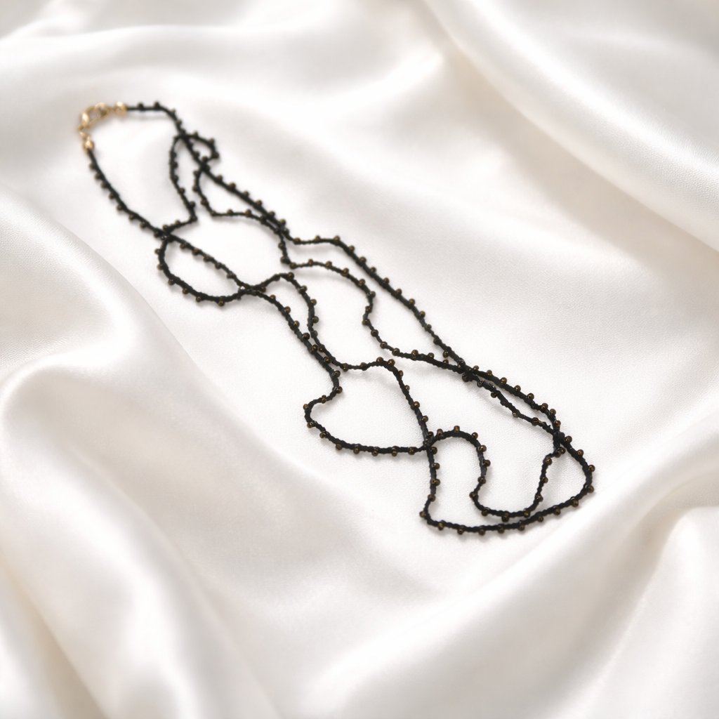 Simple woven silk thread with black bead necklace - Gold tone clasp - Measures 30" long - Easy to double