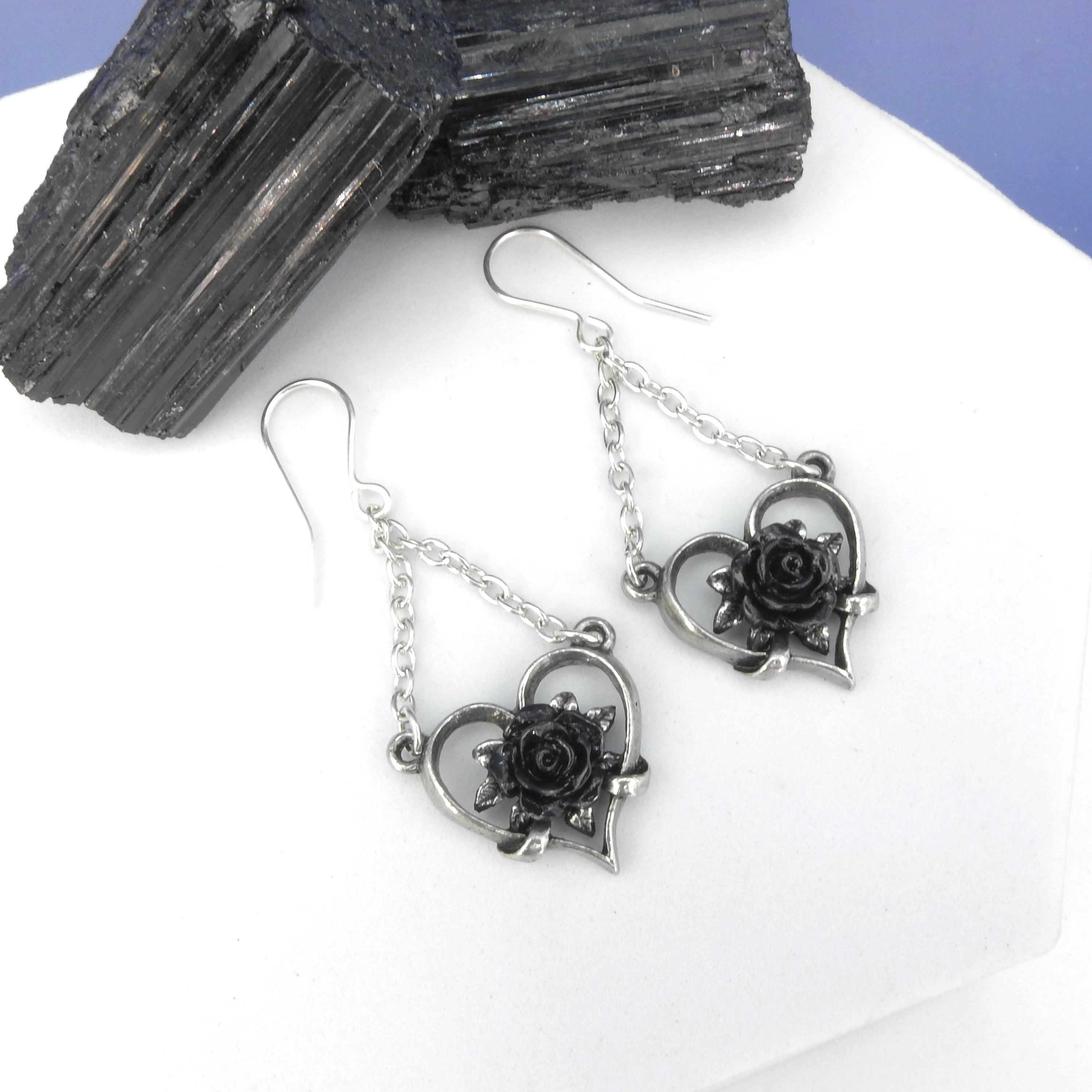Make a statement with these pewter "Heart of Blackness" earrings - English pewter with oxidized details - An open heart with a black rose center - Dangling from a chain - Measures 1 5/8" long 1" wide - Fishhook ear wires Made in England