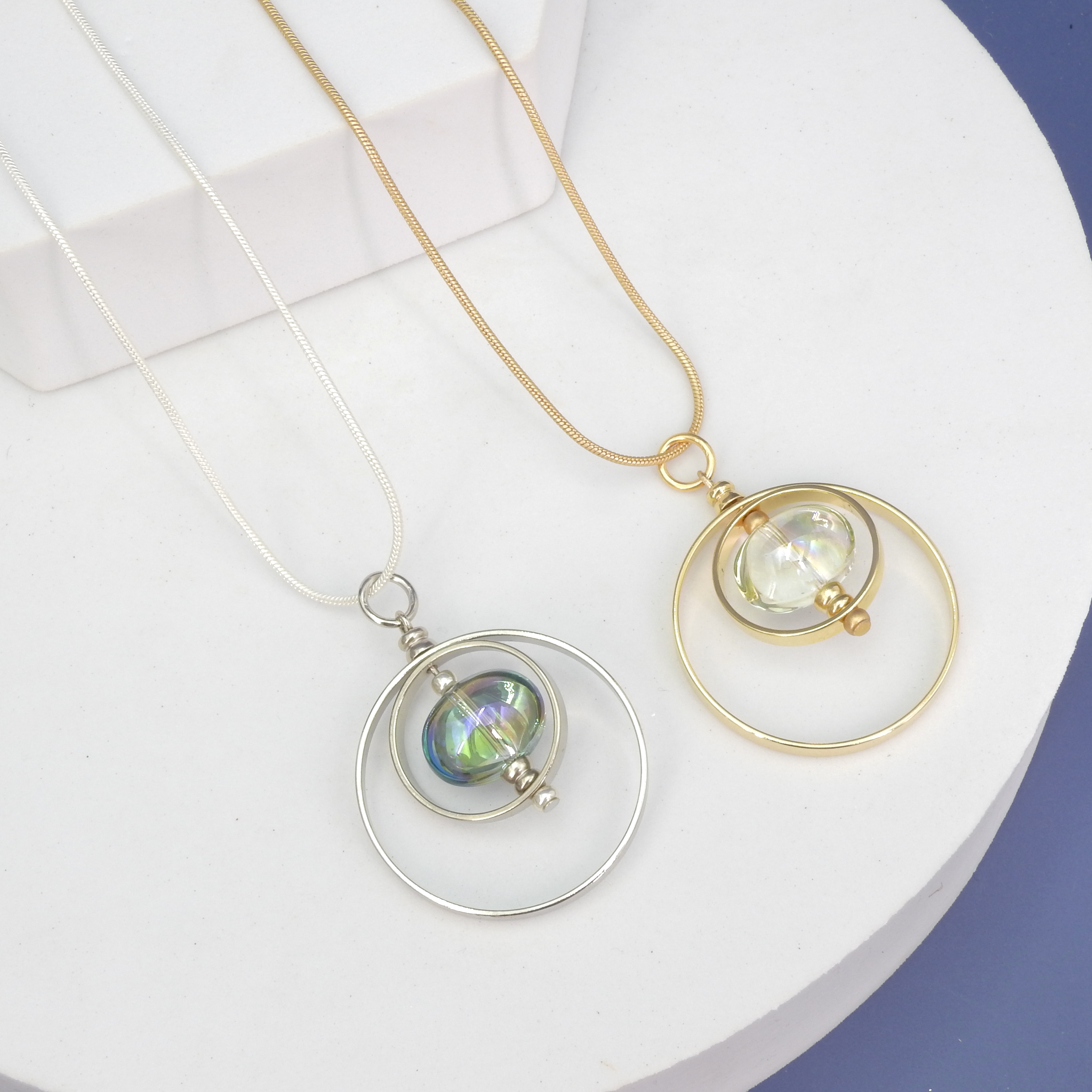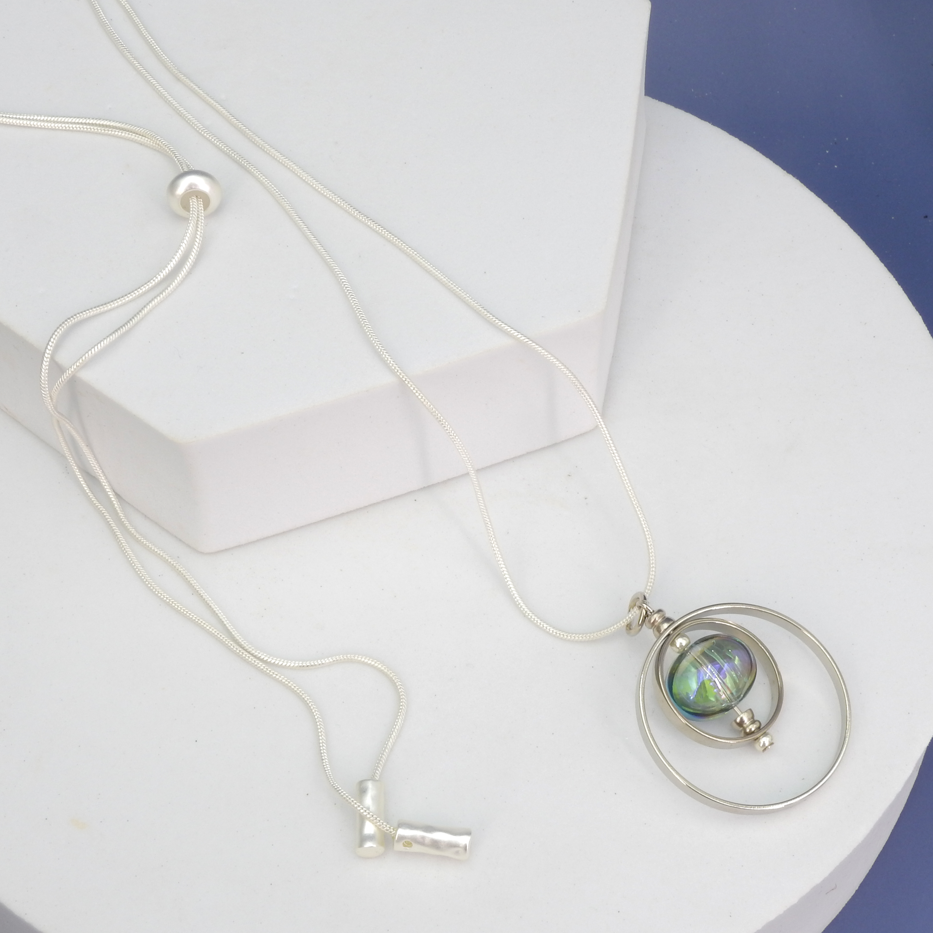 Modern geometric circle necklace made by American artist John Michael Richardson - Double hoops - Aurora Borealis glass bead in center - Pendant dangle measures 1 3/4" long 1 1/4" wide - Adjustable slide lets you extend to 32" long for added flexibility - Made in the USA Choose between silver or gold tone metal