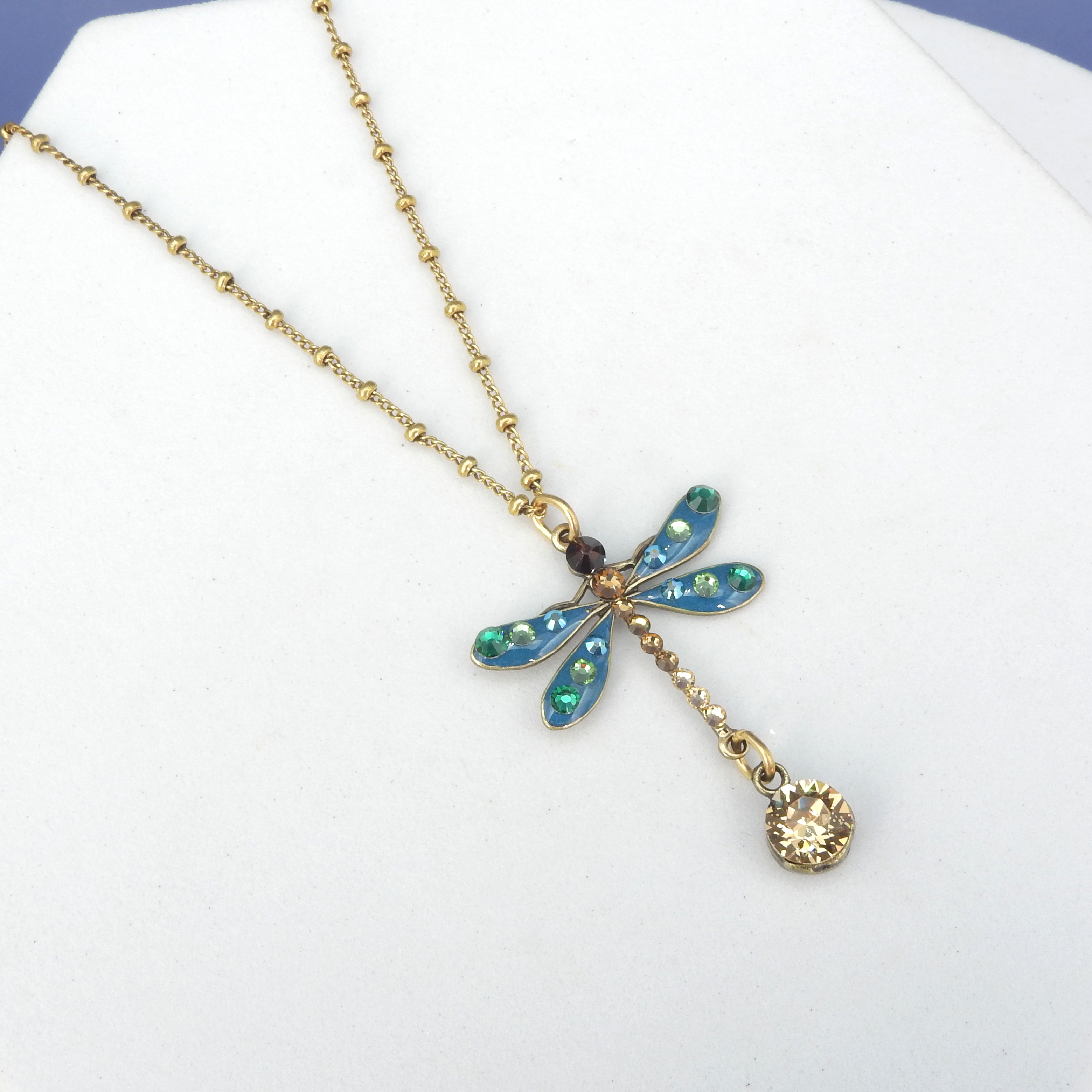 Handcrafted in NY, this lovely single enamel & crystal dragonfly necklace will make the perfect gift for you or someone you love - Gold tone base metal - Colorful crystals with single crystal dangle - 1 1/2" long 1" wide - Adjustable chain 16" - 18" long - Nickel free - Made in the USA