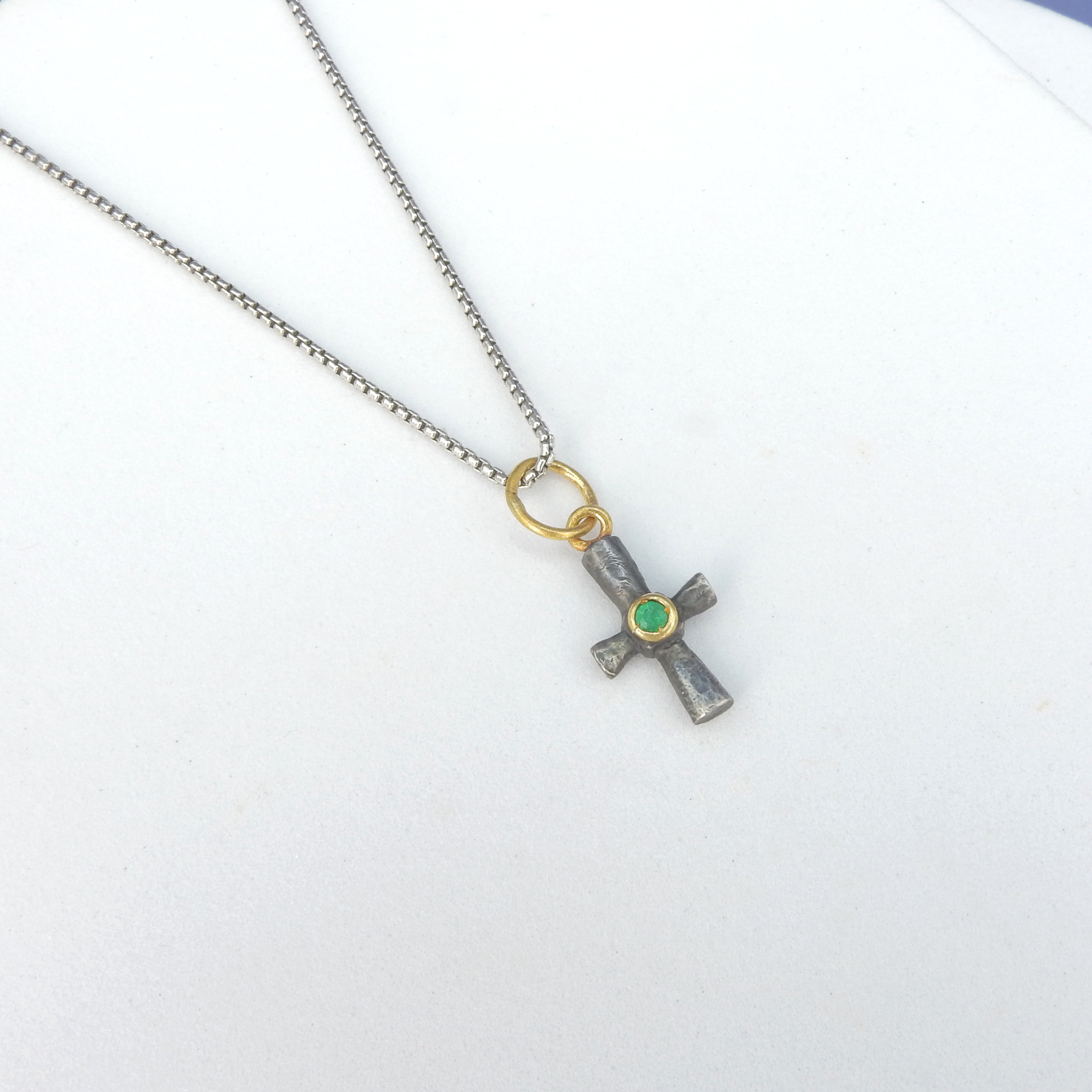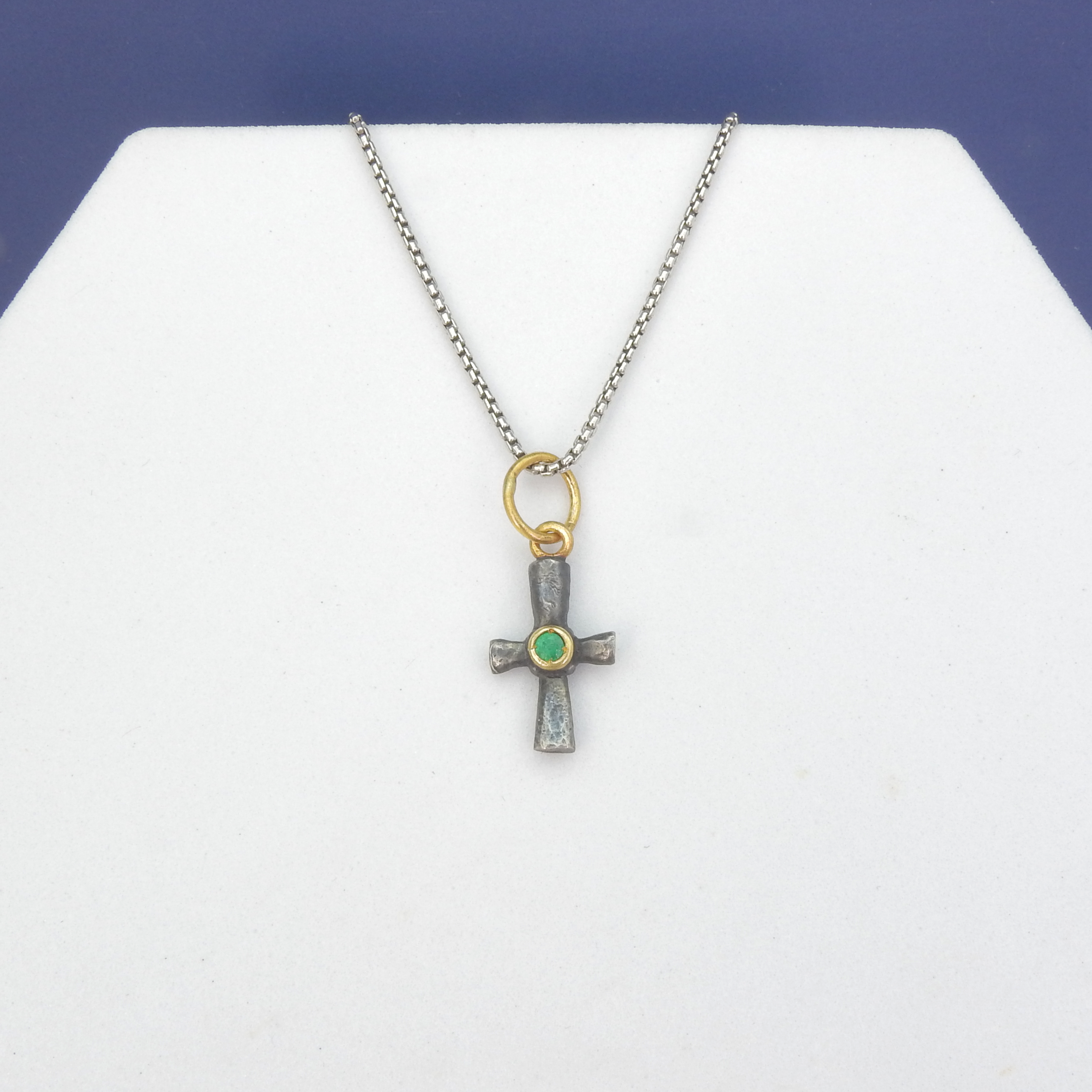 This small oxidized silver and 24KT gold cross pendant with an emerald is on trend and perfect for layering - A small emerald set in 24KT sits in the center - Handmade in Turkey - Decorative oxidized sterling silver - Measures 7/8" long with 24KT gold bale 3/8" wide - 18" oxidized sterling silver chain included