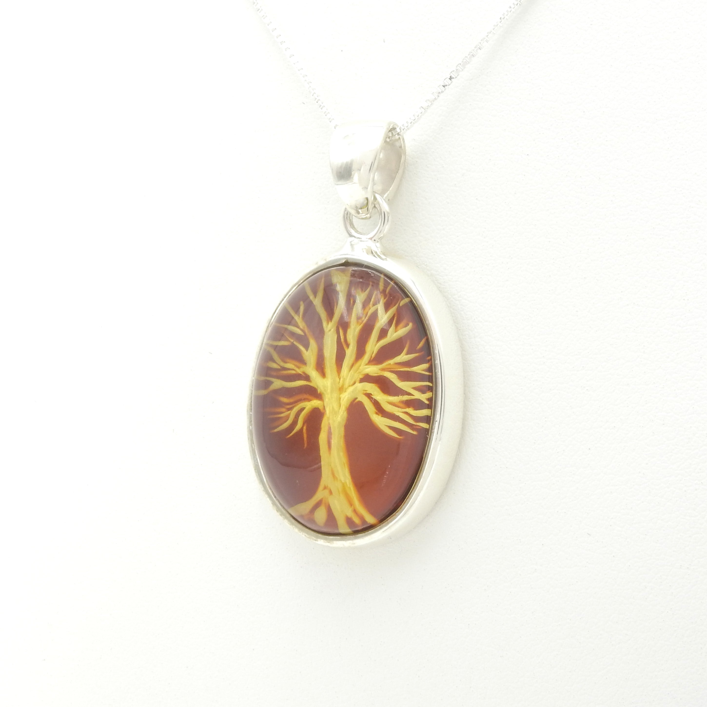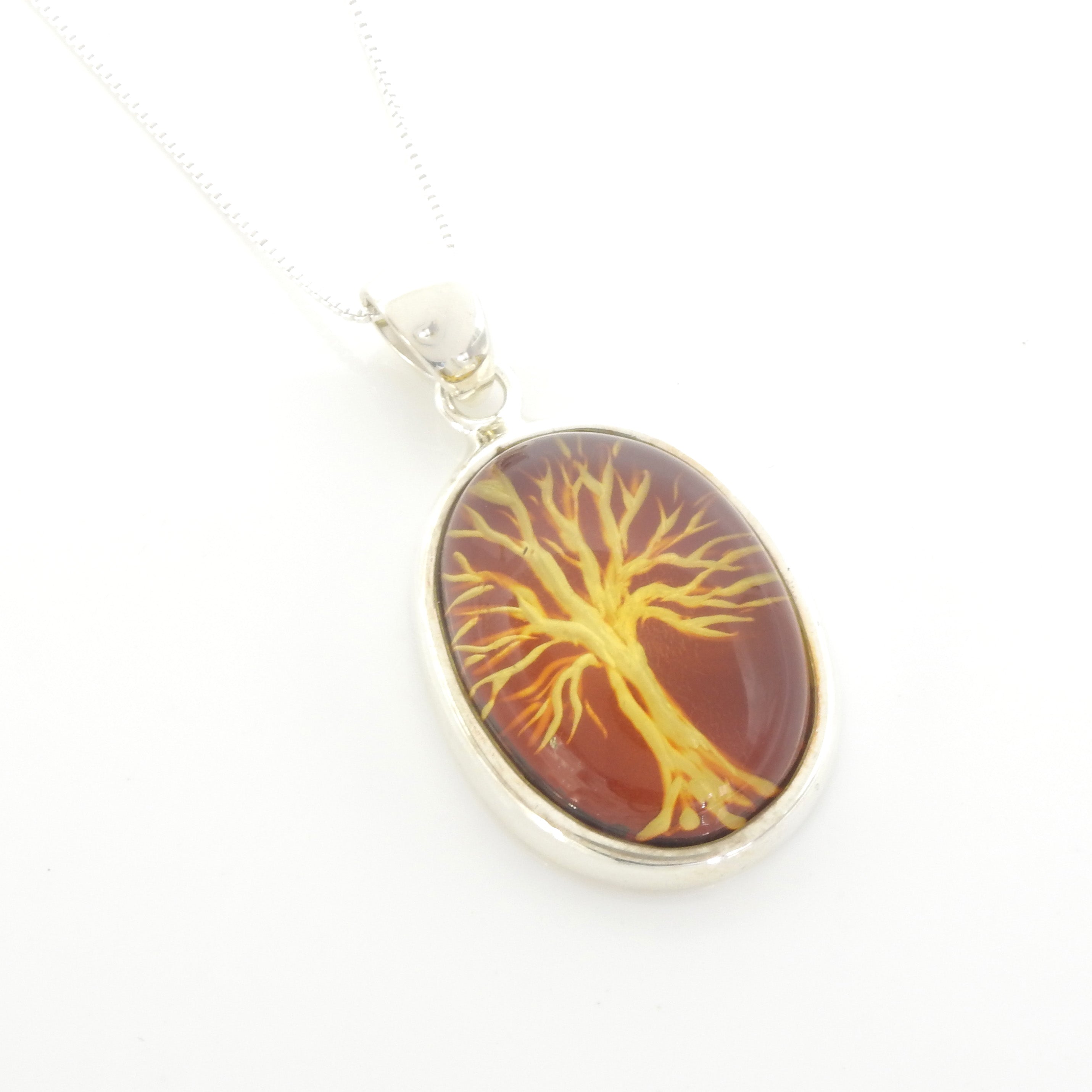 A hand-carved Tree of Life makes this amber pendant a stand out - Baltic amber in a polished dome shape - Tree of Life carved from the back to give a 3D effect - Set in sterling silver - Measures 1 7/8" long with bale 1" wide - 18" silver chain included - Each piece is hand-carved so will vary slightly