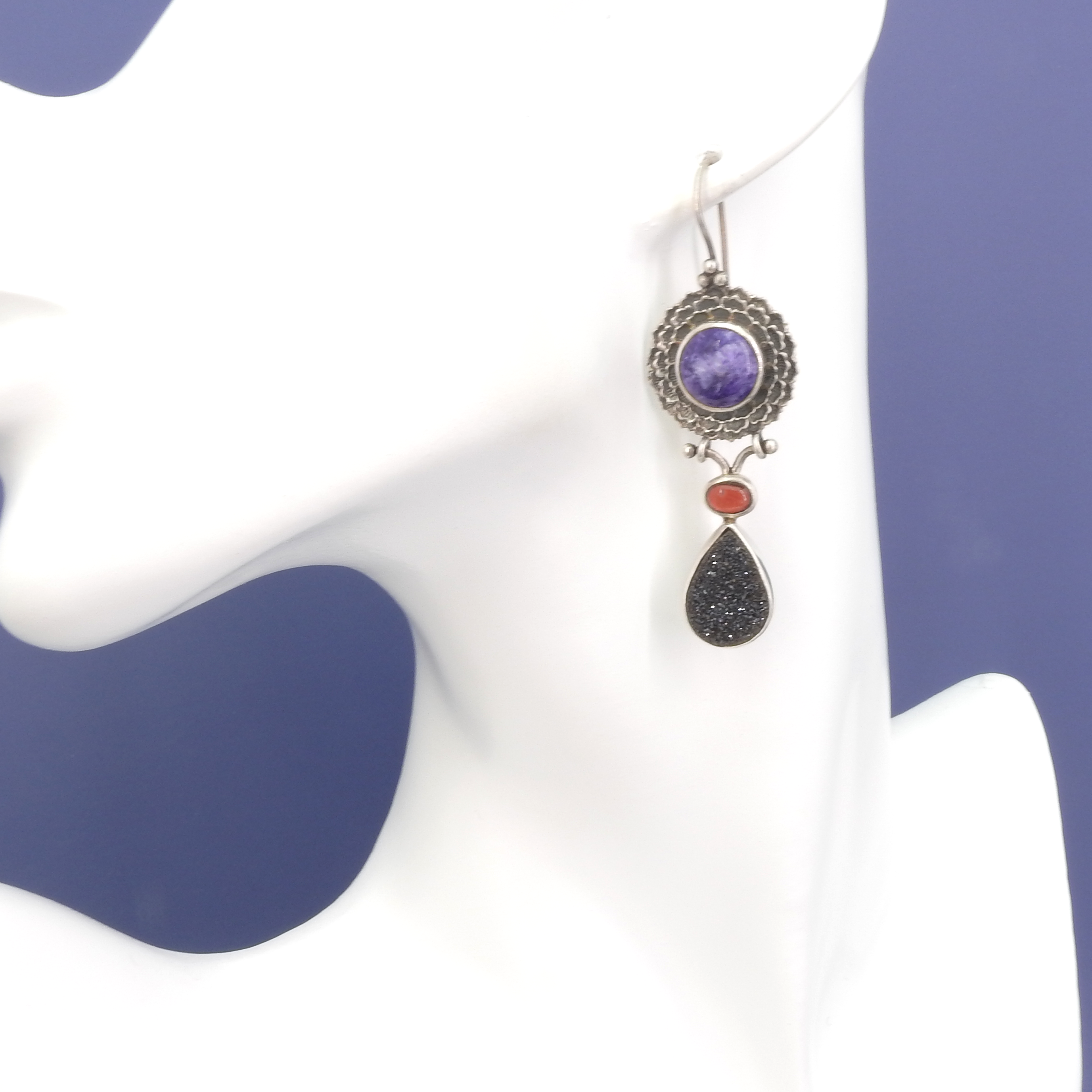 Designed by Nirit Rechtman. One-of-a-kind originals with hand-picked exceptional gemstones set in sterling silver. These designs are only sold at Iriniri - Sterling silver with oxidized details - Vibrant charoite focal stone - Garnet & black druzy hinged drop - Measures 1 3/4" long 3/4" wide - Fishhook ear wire with latch