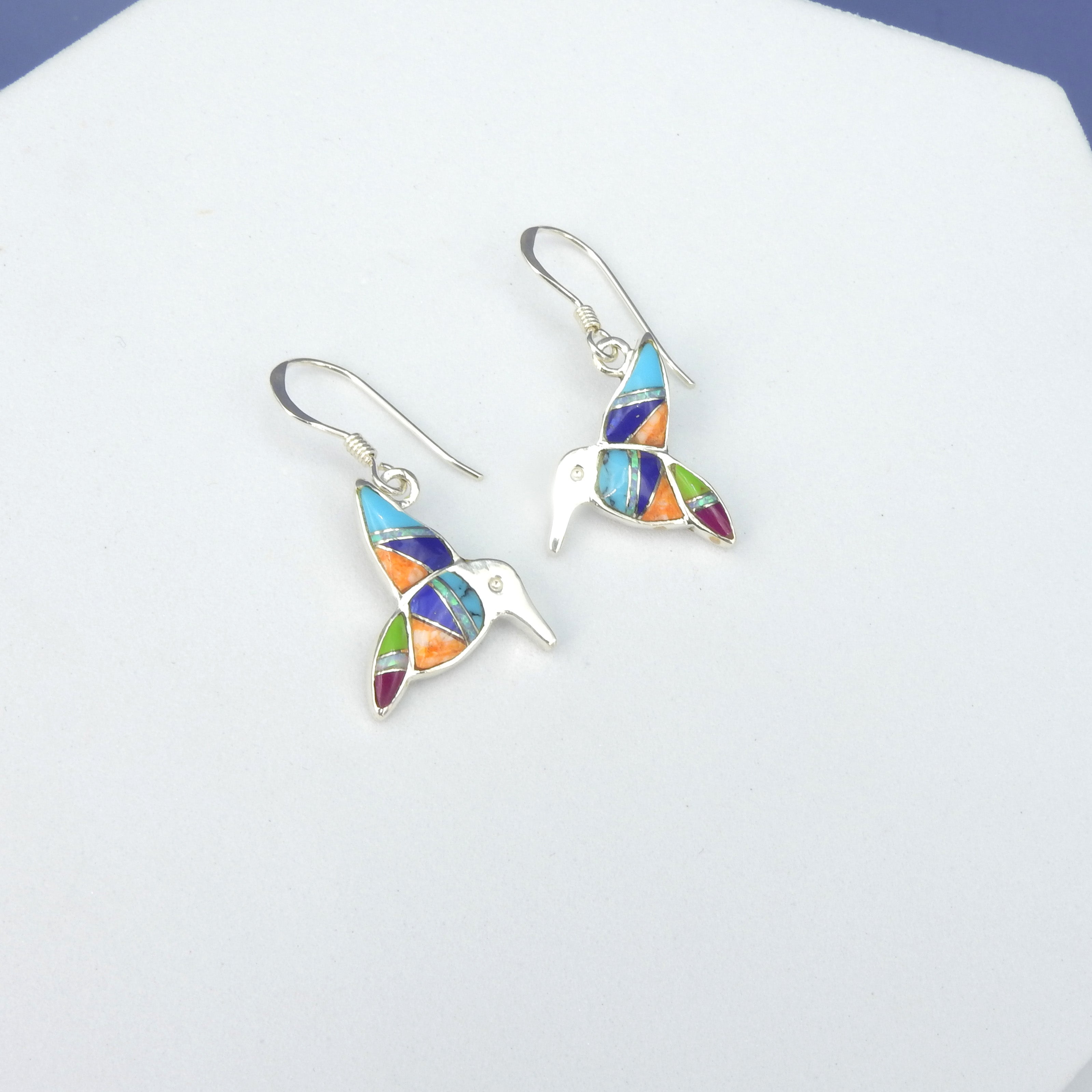 Pretty little inlay hummingbird earrings - Handcrafted in the USA - Inlayed with lapis, turquoise and oyster coral - Set in sterling silver - Measures 3/4" long 1/2" wide - Sterling silver fish hook ear wire
