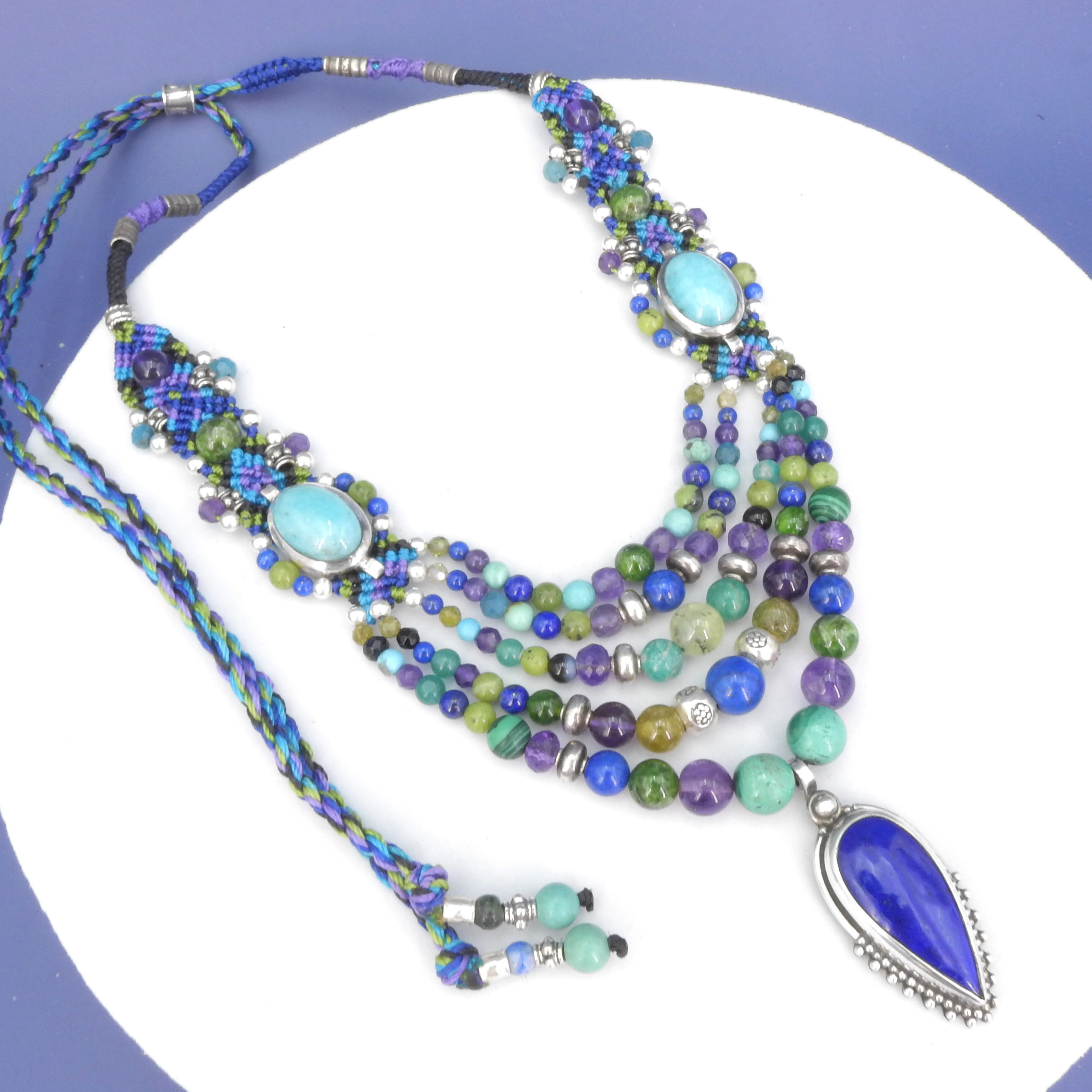 Handmade one-of-a-kind beautiful statement multi strand knotwork necklace - Focal lapis dangle in silver setting - Multi strands of gemstones topped with chrysoprase - Beads of lapis, malachite, amethyst and silver - Focal turquoise dangle measures 1 1/2" x 5/8" - Adjustable to 26” long - Durable and hand washable using a toothbrush and mild soap