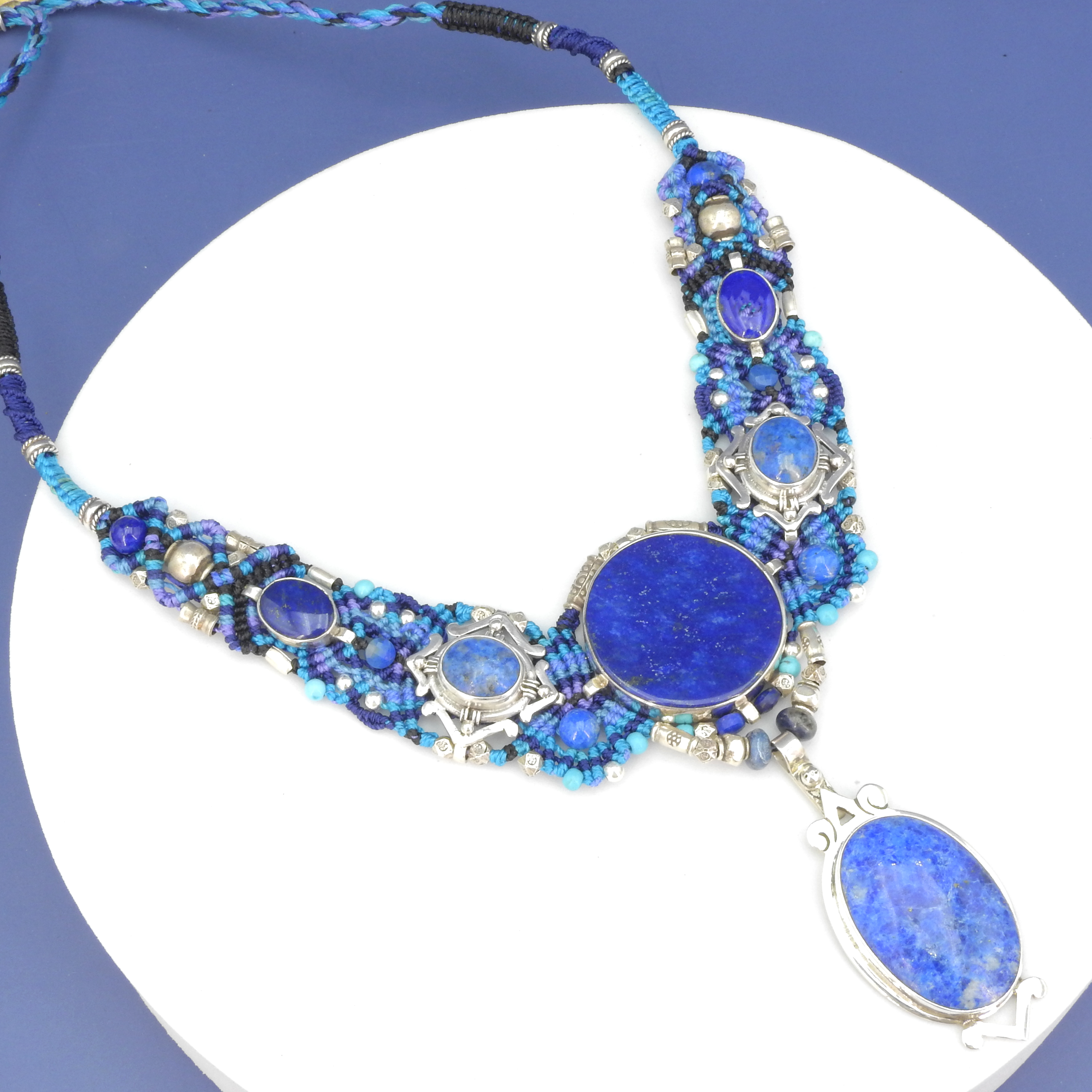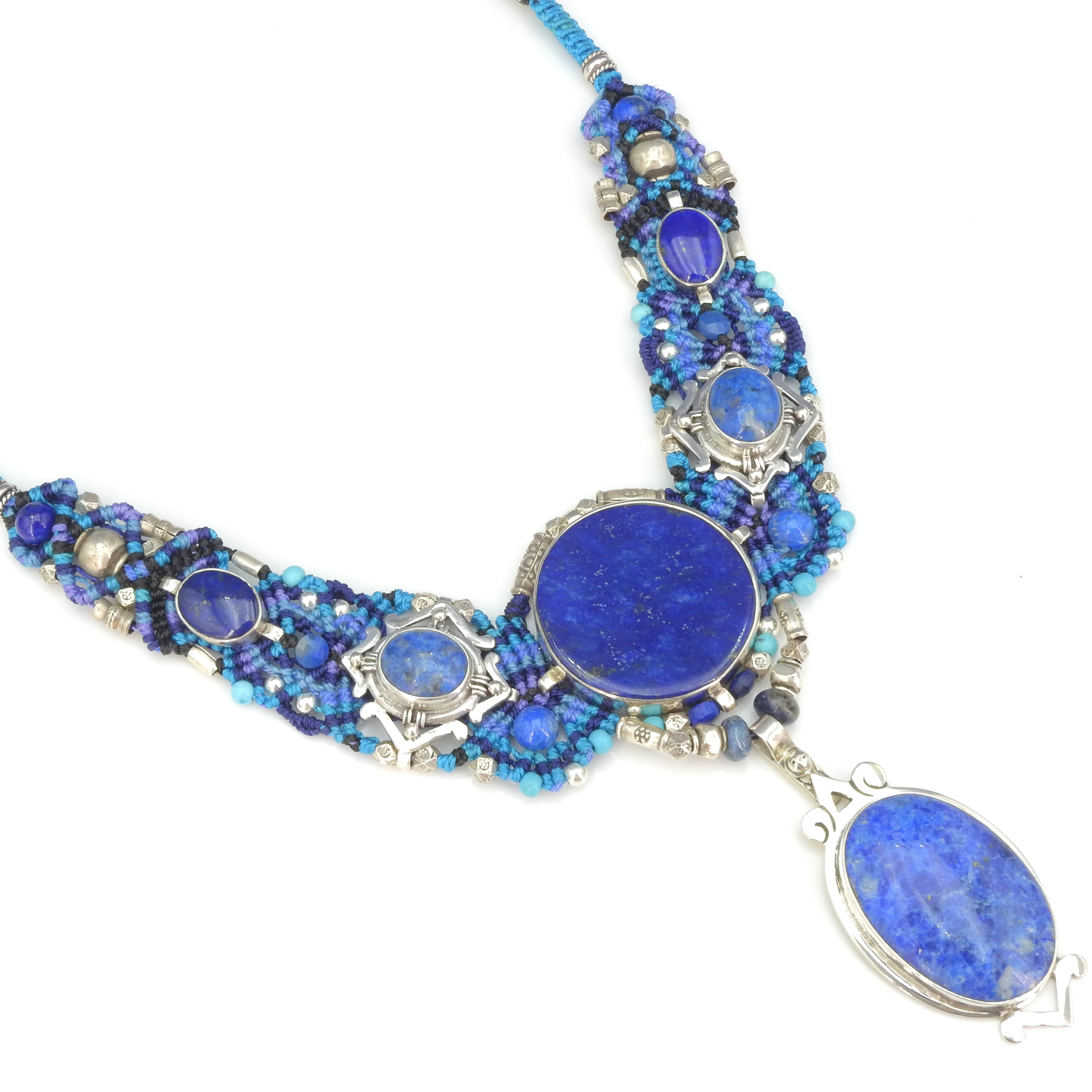 Handmade one-of-a-kind stunning knotwork statement necklace - Gorgeous large lapis in this standout necklace - Lapis set in sterling silver - Beads of lapis, turquoise and silver are woven in - Center stone with attached dangle measures 3 5/8" long x 1 1/4" wide - 7" of decoration - Adjustable to 26” long - Durable and hand washable using a toothbrush and mild soap