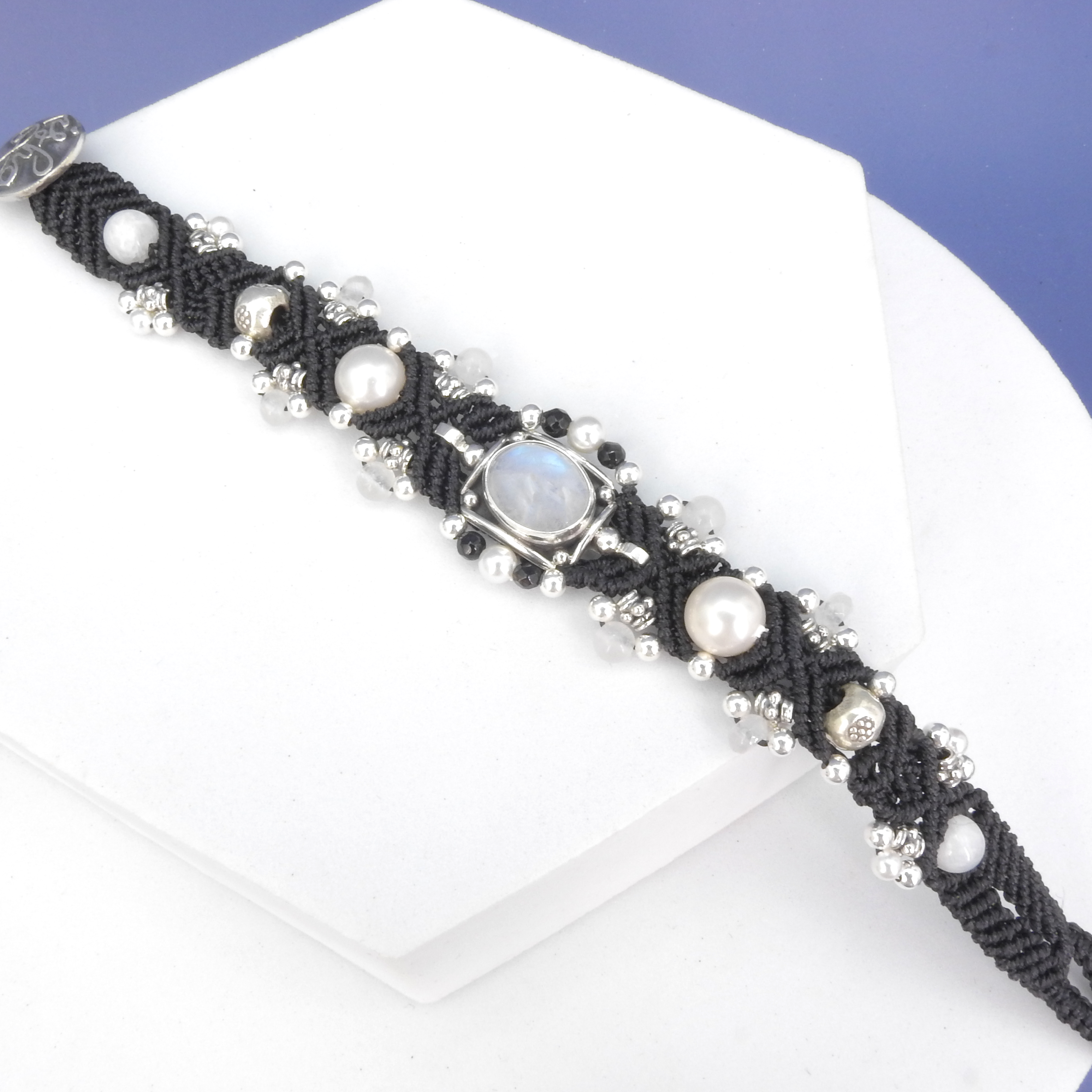 Handmade one-of-a-kind stunning knotwork bracelet - Focal moonstone set in sterling silver - Beads of moonstone, pearl and silver are woven in - Center stone measures 1/2" square - Adjustable from 6 1/4" - 7" long - Button closure - Durable and hand washable using a toothbrush and mild soap